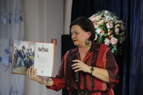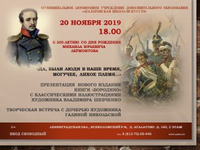 В исполнении учеников театрального отделения прозвучало стихотворение М.Ю. Лермонтова "Бородино". О работе над иллюстрациями к книге, ярком жизненном пути, творческих исканиях отца рассказала дочь художника Галина Никольская. В 1963 году рисунки к лермонтовскому стихотворению "Бородино" художнику заказала студия "Диафильм". А в 1978 году в издательстве "Советская Россия" вышла книга с иллюстрациями В. Шевченко, оригиналы которых сейчас хранятся в музее-панораме "Бородинская битва".