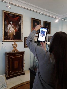 Во время проведения квеста студенты - фармацевты воспользовались также технологией дополненной реальности "Артефакт" (Министерства культуры). С помощью мобильного приложения учащиеся посмотрели дополнительные фотографии и информацию о Синодальной грамоте (1762 г.), копии с портрета Д.Г. Левицкого "Портрет Екатерины II в виде законодательницы в храме богини Правосудия", коронационные сборники Александра III и Николая II.На выставке "Блаженству общему радея..." участники квеста увидели меню обедов, выполненные по рисункам известных художников В.М.Васнецова и Н.Н.Каразина, бокал с вензелем Елизаветы Петровны, изображения гербов на фарфоровых тарелках.