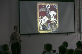 Мы рассуждали о роли животного в произведениях искусства, рассматривали народную игрушку, древнерусские иконы и шпалеры XVIII века. Ребят заинтересовали охотничьи сцены на картинах художника И.Ф. Гроота и немного рассмешило, что в старину художника-анималиста называли «звериного художества мастер».