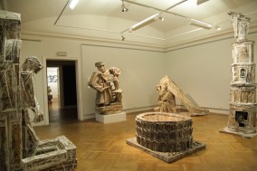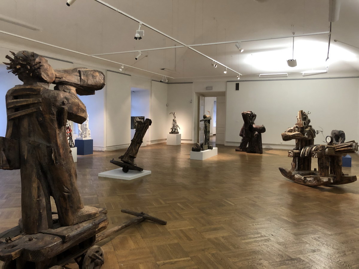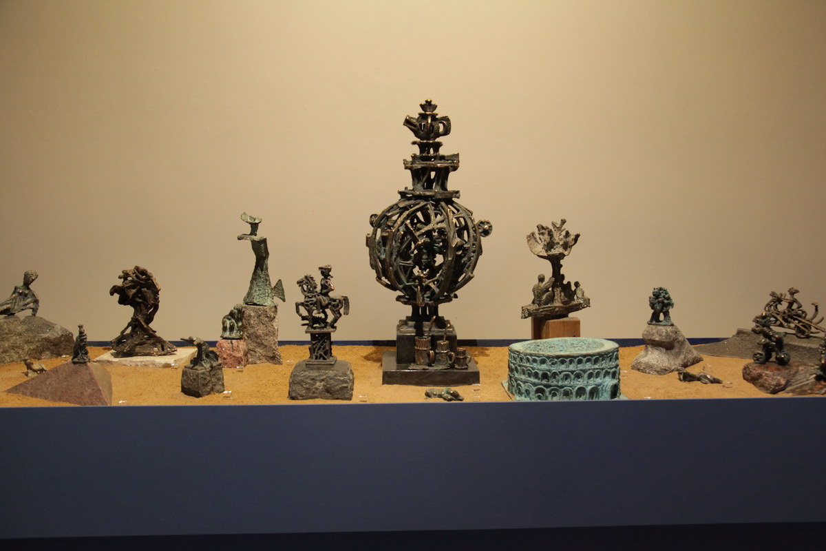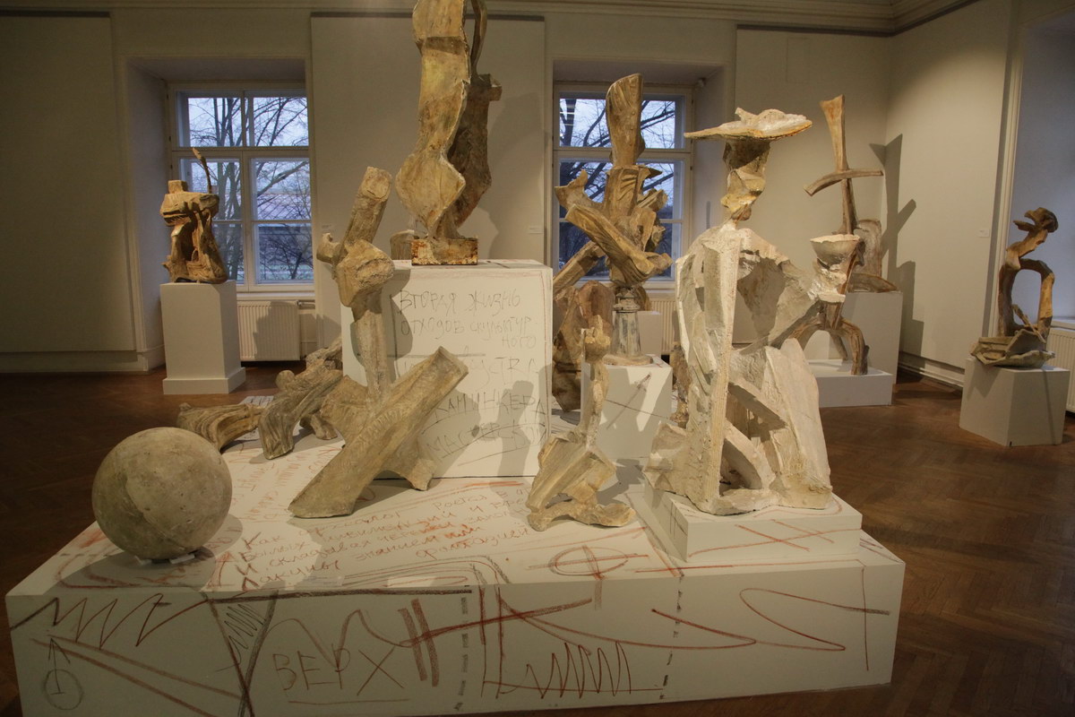 Экспозиция выставки построена не на хронологической последовательности создания произведений, а на принципе широкого показа работы скульптора в разных материалах – в бронзе, камне, дереве, гипсе или бумаге. Каждый материал, в свою очередь, в полной мере раскрывает особенности авторского стиля и многообразие его творческих поисков. Игра смыслами, их множественность и многослойность, подчас парадоксальное соединение мифа и реальности, истории и современности отличает многие произведения скульптора, рассчитанные на серьезное и вдумчивое осмысление.
