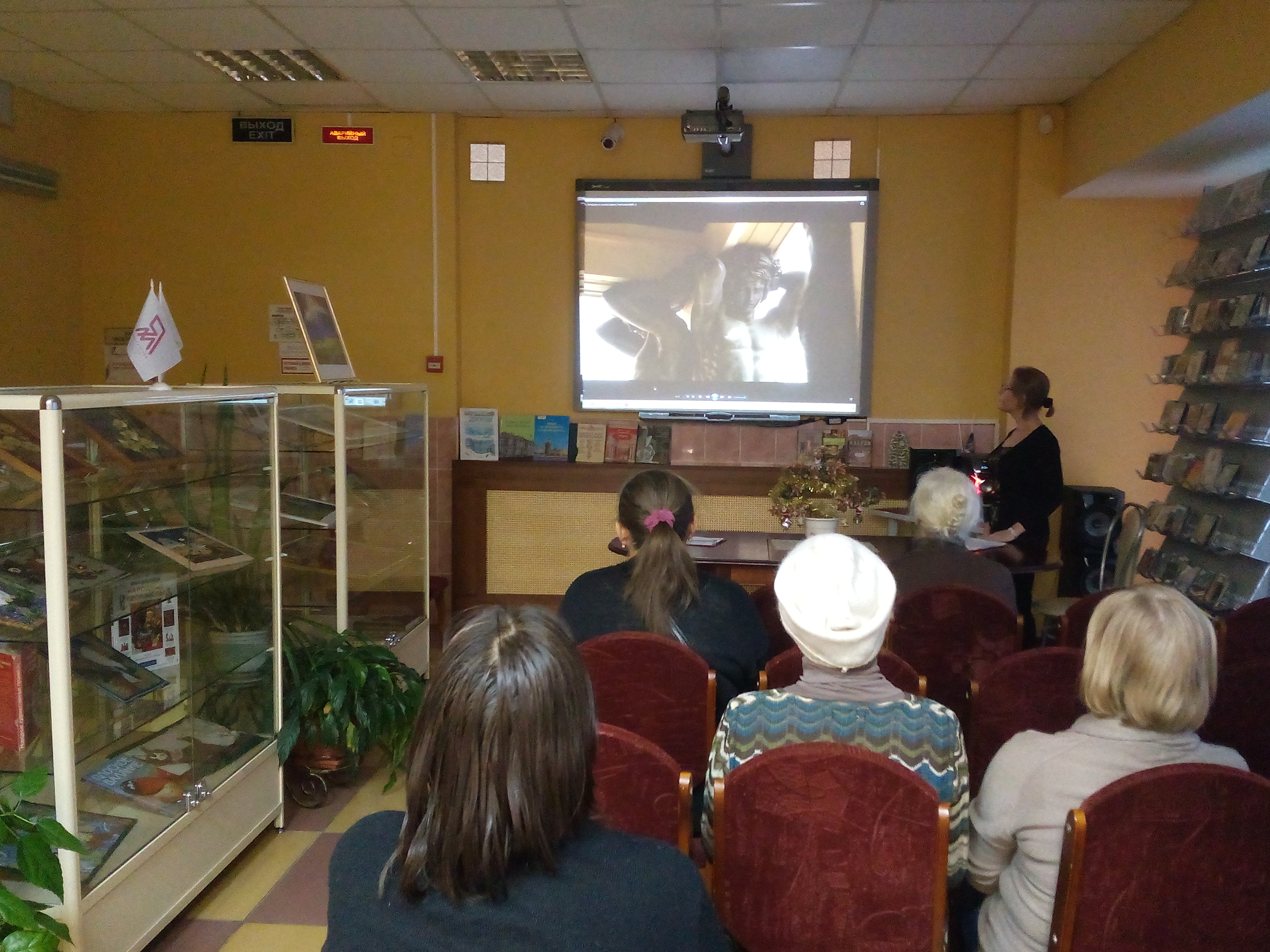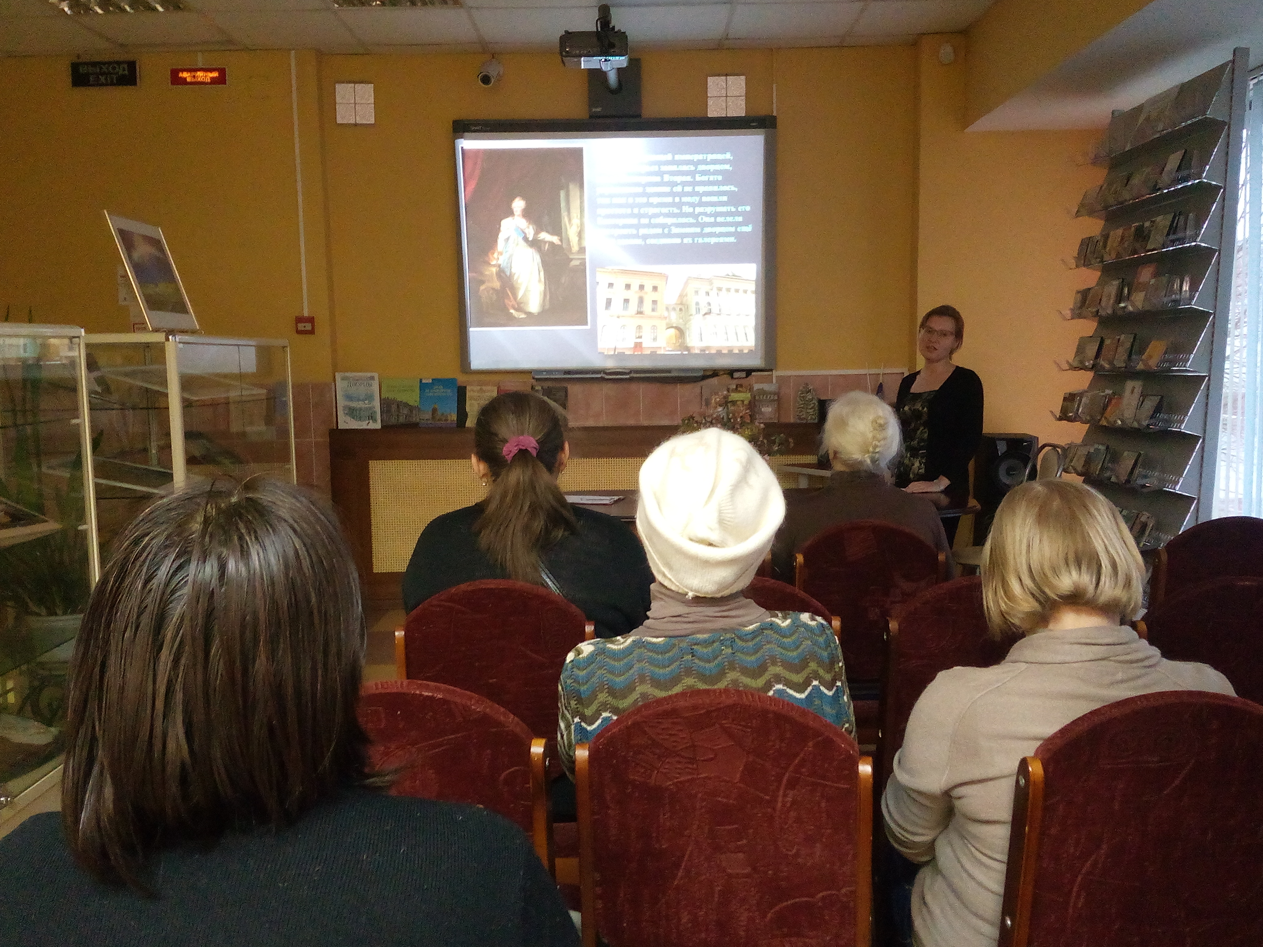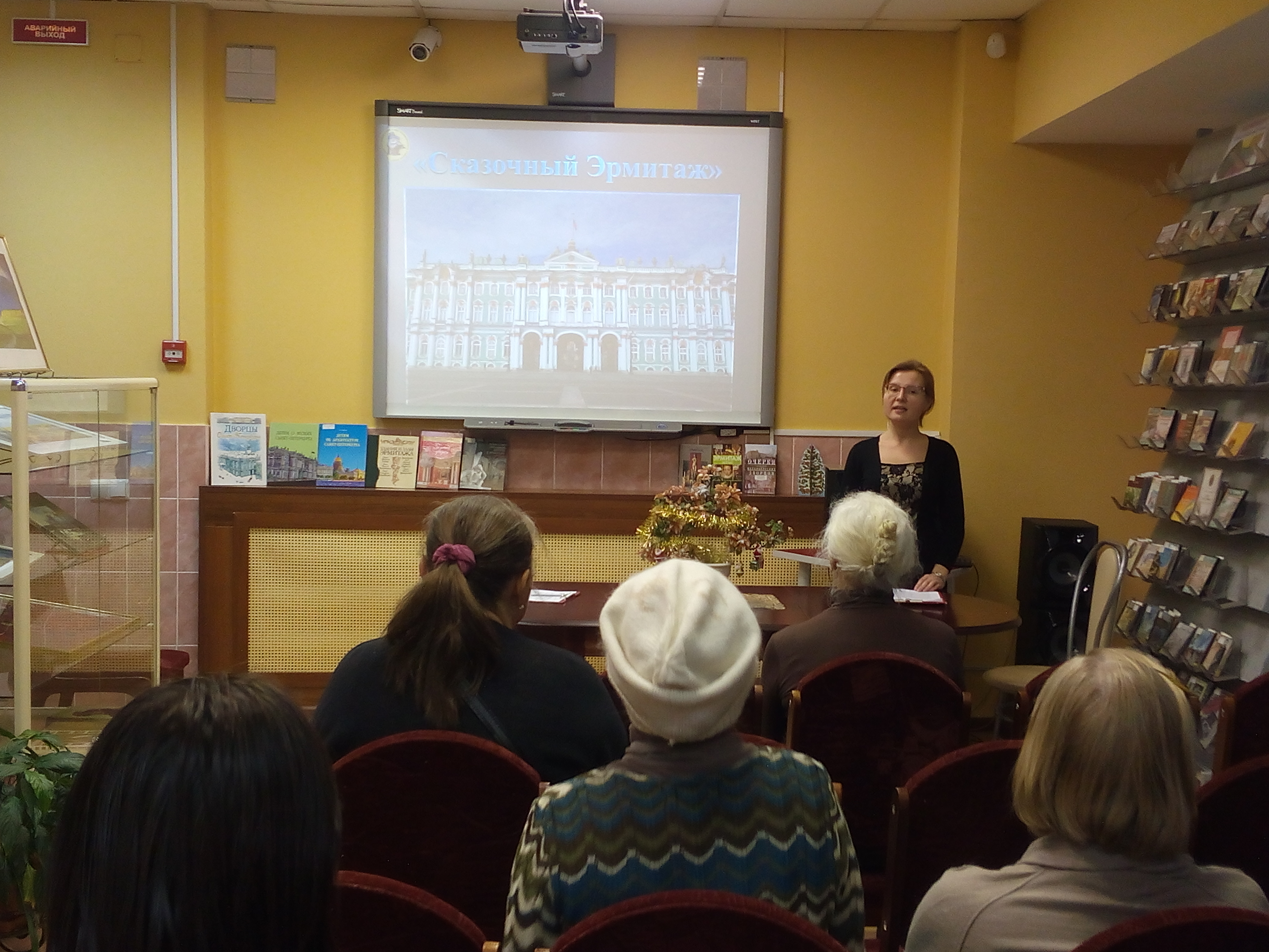 Библиотекарь зала искусства Ольга Николаевна Лыженкова провела беседу «Эрмитаж». Ведущая рассказала историю строительства Зимнего дворца, а также о том, как дворец стал музеем, какие богатства в нем хранятся. Беседу дополнила виртуальная видео-экскурсия по залам  музея, а также блиц-обзор изданий из фонда библиотеки.