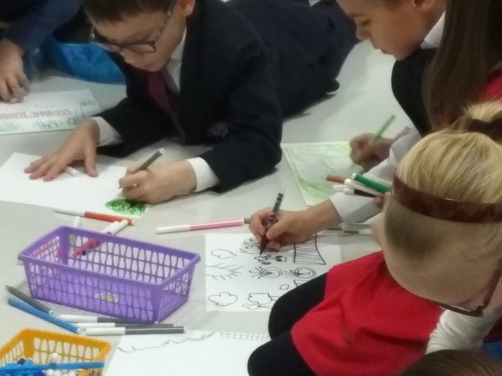 В конце занятия учащиеся соотнесли названия и изображения дворцов музея. Нарисовали свой Русский музей по впечатлениям от увиденных работ.