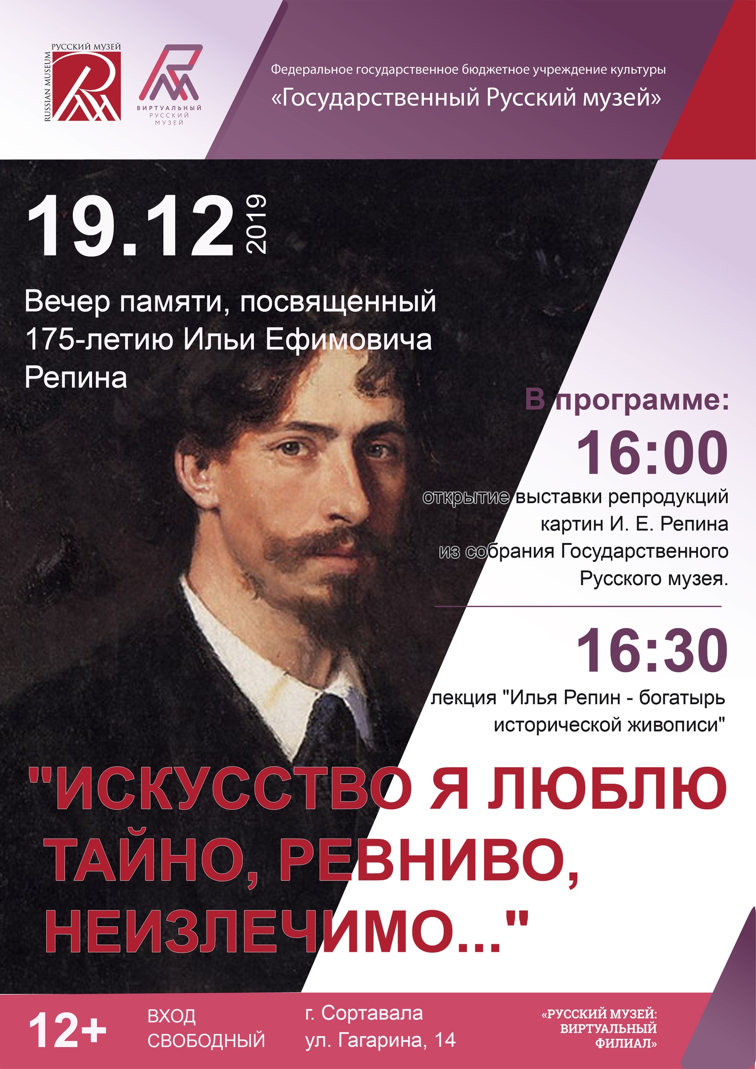 19 декабря в Сортавальской межпоселенческой районной библиотеке пройдет вечер памяти, посвященный 175-летию со дня рождения Ильи Ефимовича Репина.
