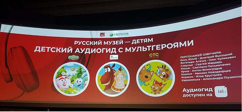 18 декабря в Центре мультимедиа Русского музея состоялась презентация детского аудиогида, разработанного Русским музеем при поддержке ПАО Сбербанк специально для детей младшего и среднего школьного возраста. Любимые герои известных мультфильмов «Три Богатыря» (студия «Мельница»), «Смешарики» и «Три кота» (телеканал СТС, студия Метрафильмс) стали гидами по экспозиции Михайловского дворца и корпуса Бенуа.