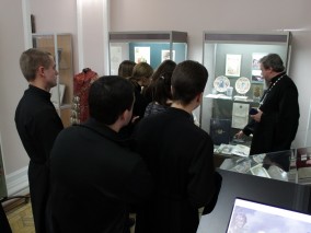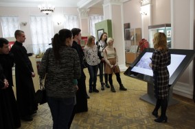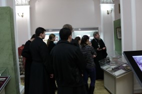Лекцию посетили 4 студента Духовной семинарии и 7 студентов ТГУ имени Г.Р. Державина 1-го курса направления "Теология". Дата для лекции выбрана не случайно, поскольку 6 декабря (по старому стилю) - это день тезоименитства Государя Императора Николая II. Протоиерей Виктор Лисюнин рассказал о традициях семейного воспитания в семье последнего императора, о том, что воспитанием и образованием своих детей Императрица заведовала лично практически по всем предметам, кроме специальных. В семье, где воспитывались царские дети, царили православные традиции. Все, кто знал семейную жизнь императора, отмечали удивительную простоту, взаимную любовь и согласие всех членов семьи. После вступительной беседы протоиерей В. Лисюнин прочитал лекцию по выставке "Блаженству общему радея...", проводя параллели о традициях воспитания и престолонаследия в разные эпохи царствования династии Романовых, начиная с воцарения Михаила Федоровича Романова. В заключении он рассказал об иконе Божией Матери "Державная", которая завершает выставку и документе об отречении от престола императора Николая II. Протоиерей Виктор Лисюнин рассказал также студентам, что эта икона редкая и о том, что впервые образ Иконы Божией Матери «Державная» был обретен 2 (15) марта 1917 года - как раз в день отречения от престола императора Николая II, будущего царственного страстотерпца, в селе Коломенском близ Москвы.