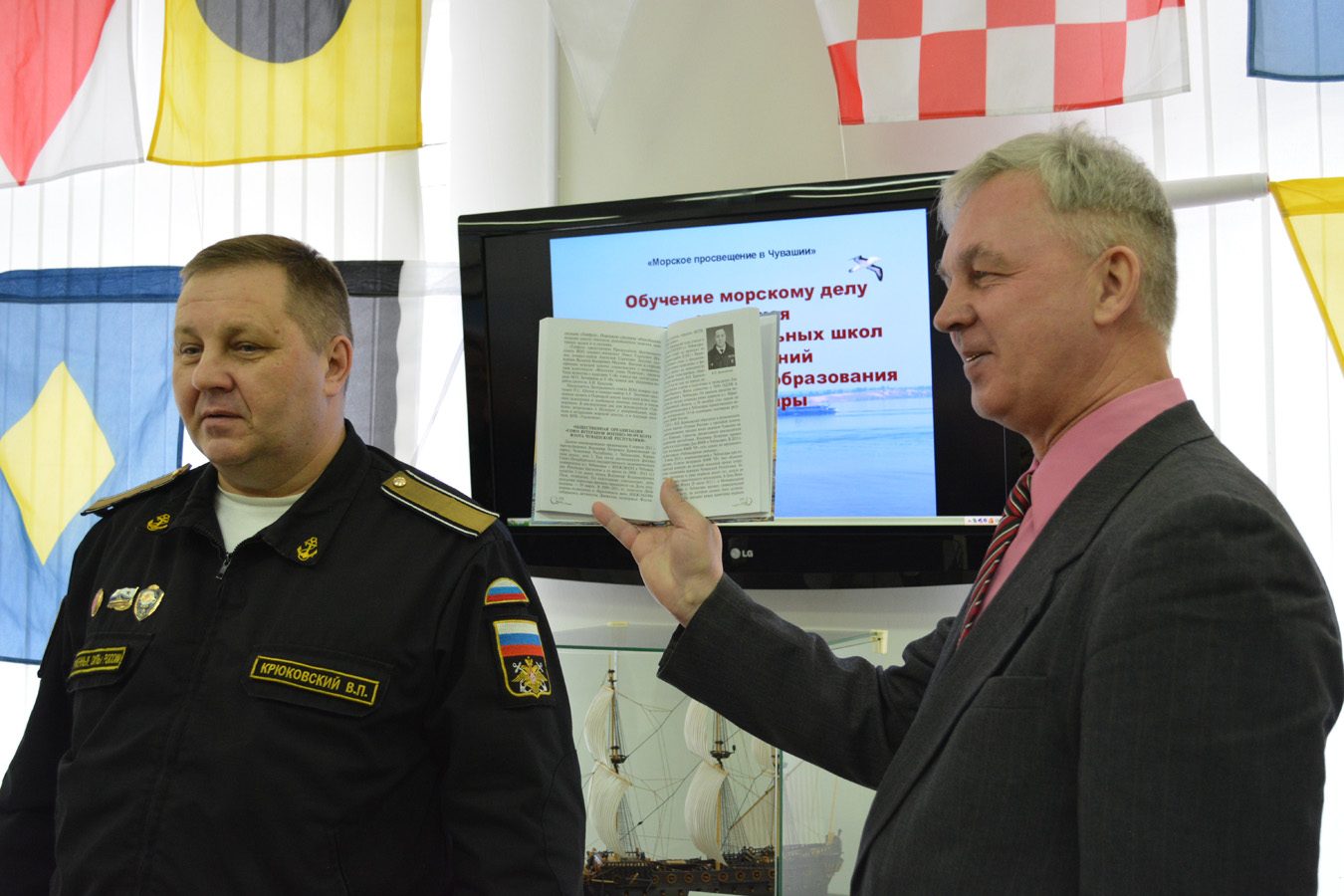 В числе гостей на презентации выступили председатель республиканского Союза ветеранов ВМФ Владимир Крюковский, председатель ЧРОО «Российский союз ветеранов» Николай Семенов. Они отметили богатые морские традиции «сухопутного» Чувашского края: в истории Республики достойное место занимают выдающийся кораблестроитель Алексей Крылов, контр-адмиралы Михаил Бочкарев, Леонид Серебренников, Иван Пахомов, Петр Галкин. Истоки и развитие этих традиций освещены в книге Валерия Голева.