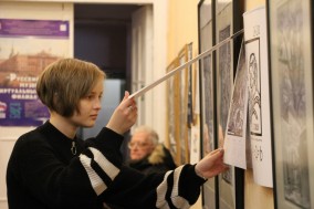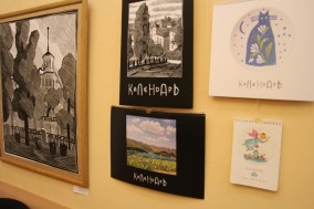 В экспозиции более 50 произведений: картины, творческие календари, открытки и конверты, скетчи и иллюстрации, постеры.