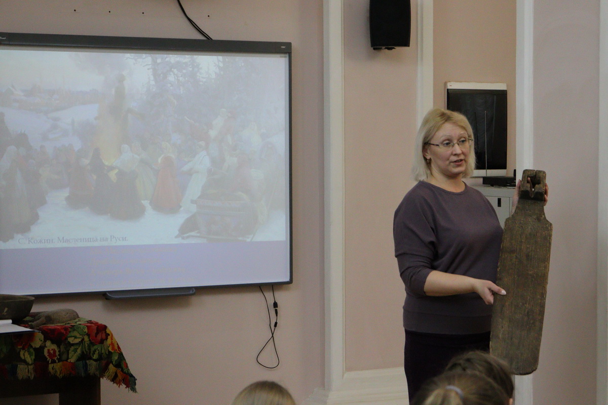Учащиеся окунулись в историю праздника. Почему праздник так называют, зачем пекут блины, как называются масленичные дни и чем люди занимаются в эти дни – это и многое другое ребята узнали из рассказа старшего научного сотрудника Пудовкиной Наталии Валерьевны.