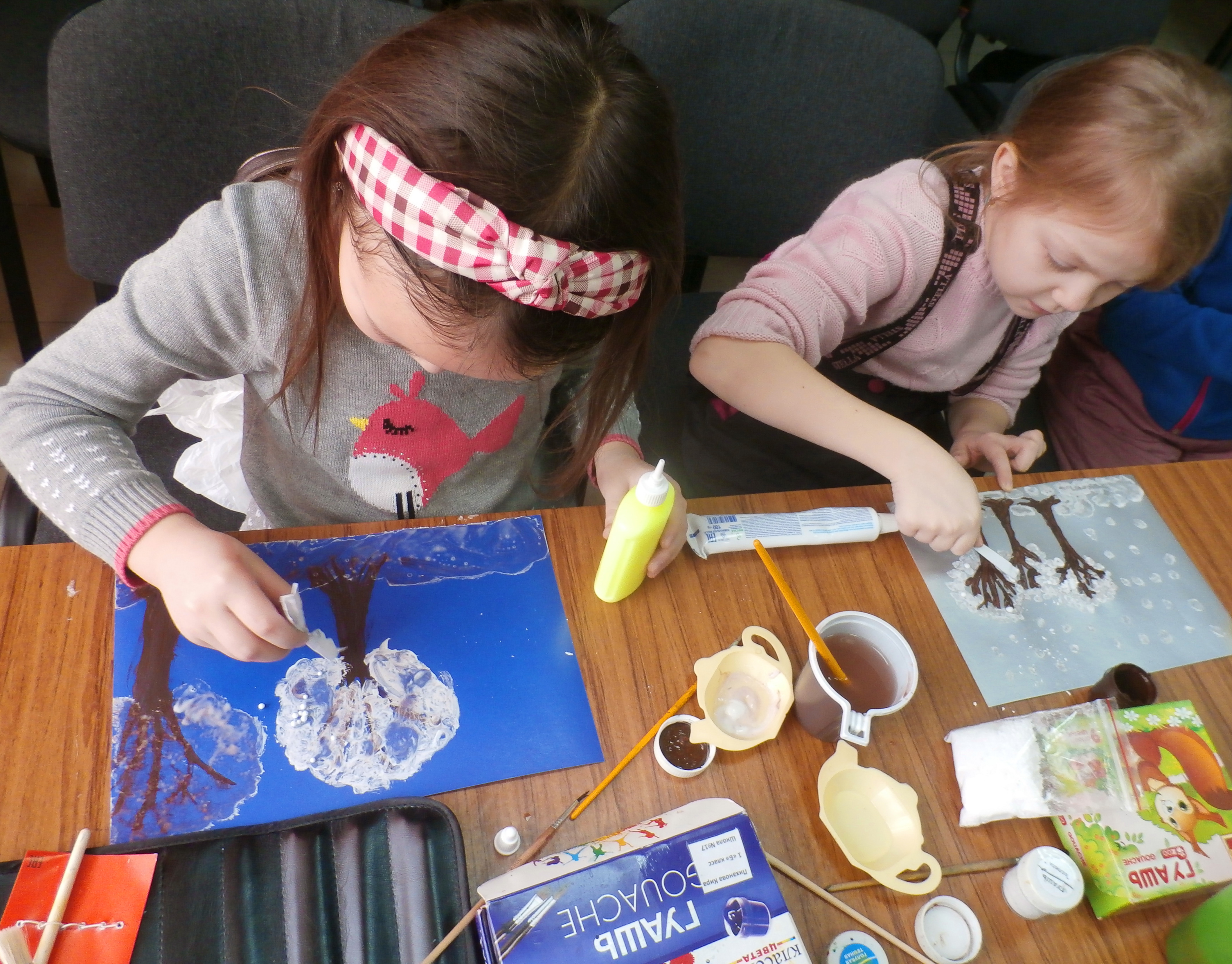 После знакомства с картинами наши маленькие соседи, как всегда, творили. Нетрадиционное рисование зимы зубной пастой доставило им большое удовольствие.