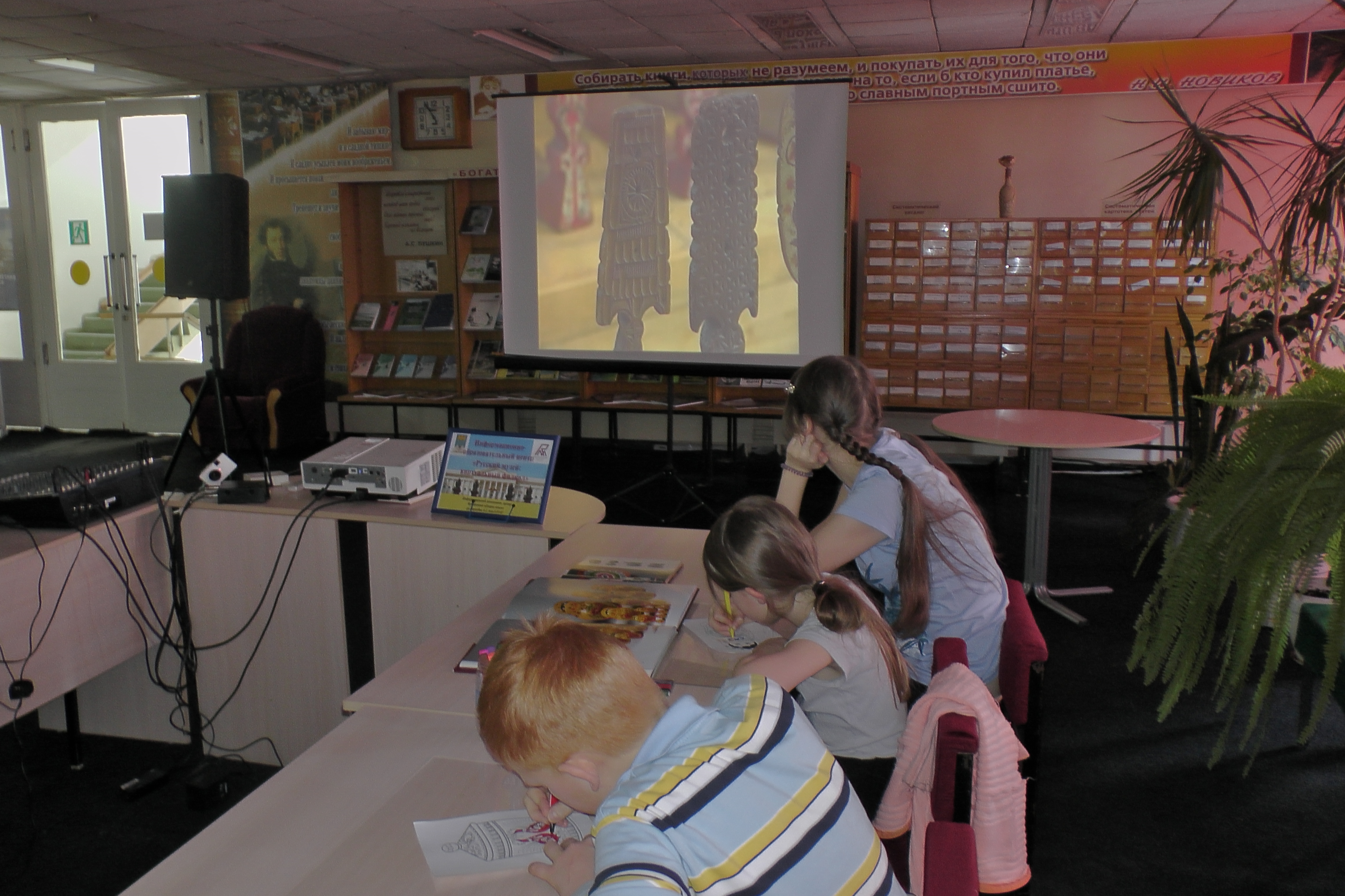 Ребята посмотрели небольшой фрагмент из видеофильма «Народное искусство» из цикла «Русский музей-детям», познакомились с эксклюзивными образцами народного творчества из электронного каталога Медиатеки виртуального филиала Русского музея, услышали рассказ об истории возникновения самобытного искусства.