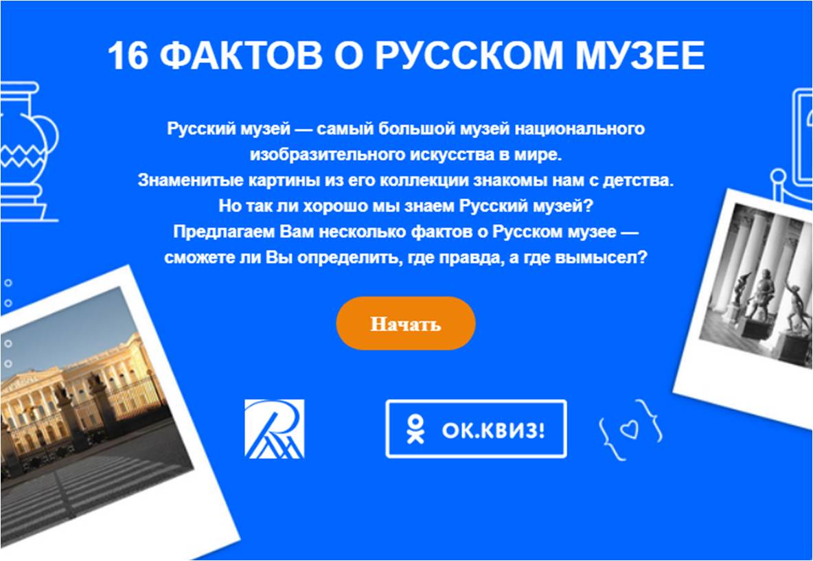 Государственный Русский музей запускает в социальной сети «Одноклассники» онлайн-викторину «Факты о Русском». Так Русский музей планирует отметить Международный день музеев. Отгадать «Факты о Русском» можно в группе музея и группе «Виртуальный Русский музей».