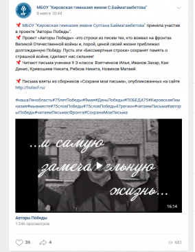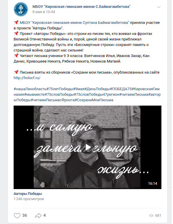 К празднованию Великой Победы вместе с гимназистами создали фильм "Сохрани мои письма" в рамках проекта "Авторы Победы". Это строки из писем тех, кто воевал на фронтах Великой Отечественной войны, и порой, ценой своей жизни приближал долгожданную Победу!