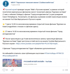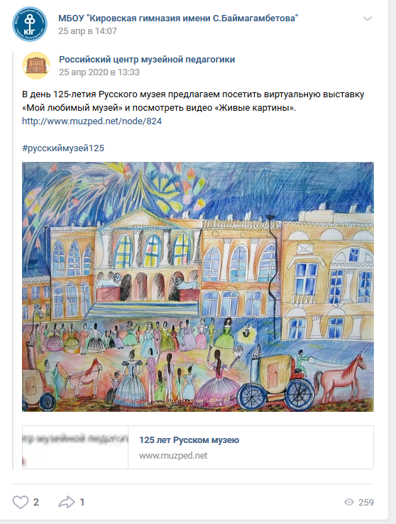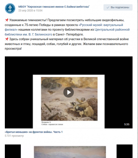 Как и вся страна, Кировская гимназия имени Героя Советского Союза Султана Баймагамбетова с конца марта перешла на дистанционное обучение. Это было очень трудно, сложно и требовало колоссалных сил, времени, определеннх навыков и терпения. Но нам все удалось! ИОЦ "Русский музей: виртуальный филиал" в силу обстоятельств переместил свою работу в социальные сети "В контакте" и "Дневник. ру".