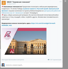 Мы старались привлечь гимназистов ко всем акциям, конкурсам, мастер-классам, организованных Русским музеем и Центром музейной педагогики. А также очень благодарны коллегам из других виртуальных филиалов за созданные мультимедийные ресурсы.