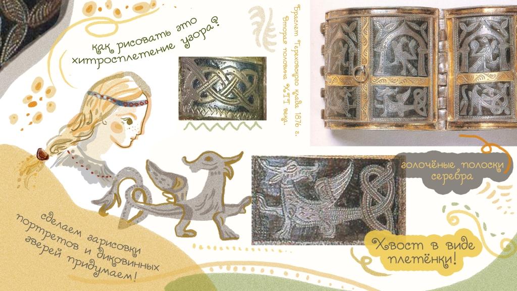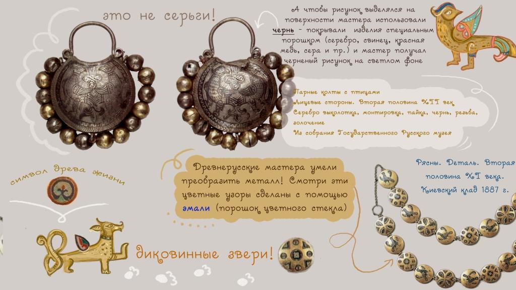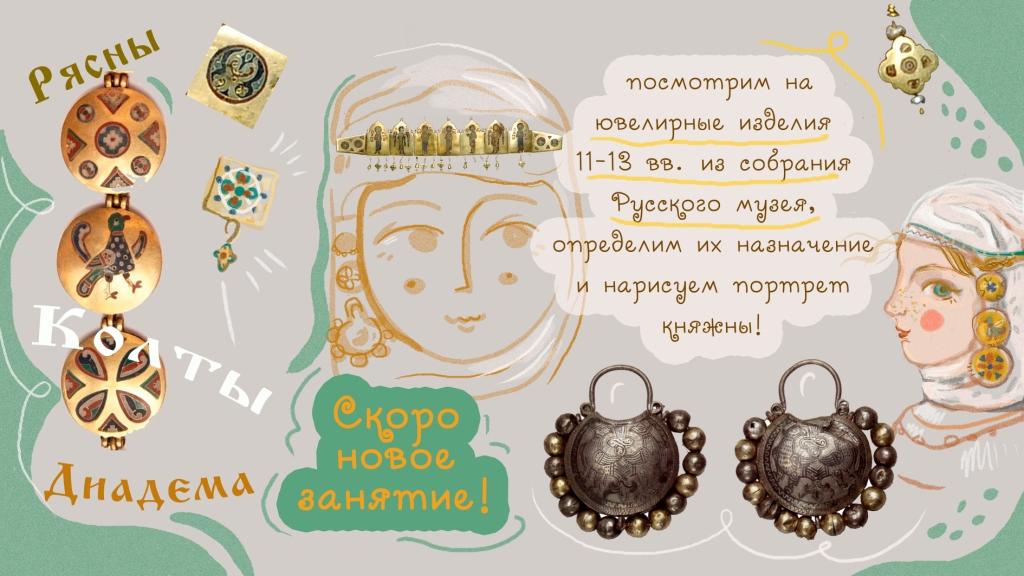 Также на первом занятии мы поговорили об эмалях, а на втором предложили узнать о серебряных изделиях. По материалам лекции «Клады Древней Руси» мы подготовили для ребят небольшое видео с заметками об украшениях и идеей княжеского портрета.