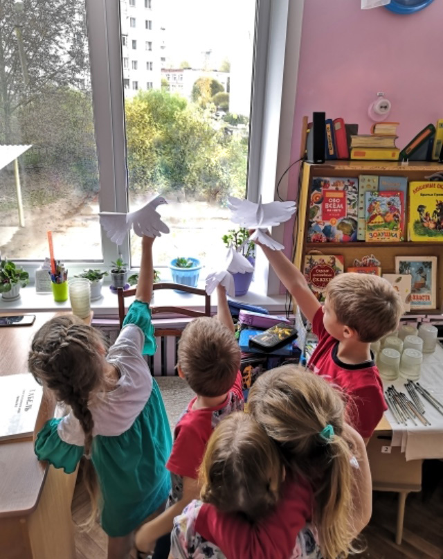 Музейные сотрудники познакомили ребят с произведениями искусства, в которых изображены голуби, а также с материалами виртуальной выставки «Великая Отечественная война. Из коллекции Русского музея и собраний музеев России». Среди материалов выставки дети наиболее внимательно рассматривали работы художников, посвященные своей малой Родине – Смоленщине. Большое впечатление на них произвели произведения Б.М.Неменского Главный герой этих графических листов – разрушенная Вязьма. В ходе мероприятия ребята познакомились с монументом, установленном близ Храма Рождества Пресвятой Богородицы, у Аллеи Памяти в честь вязьмичей, погибших при выполнении конституционного воинского долга. Это огромный гранитный валун природного происхождения, с которого взлетают в небо бронзовые голуби – символ душ погибших солдат и офицеров, которые обрели покой и свободу. В память о героях участники акции сделали белых бумажных голубей и в 10.30 осуществили символический запуск голубей под музыку И.Дунаевского «Летите голуби, летите».