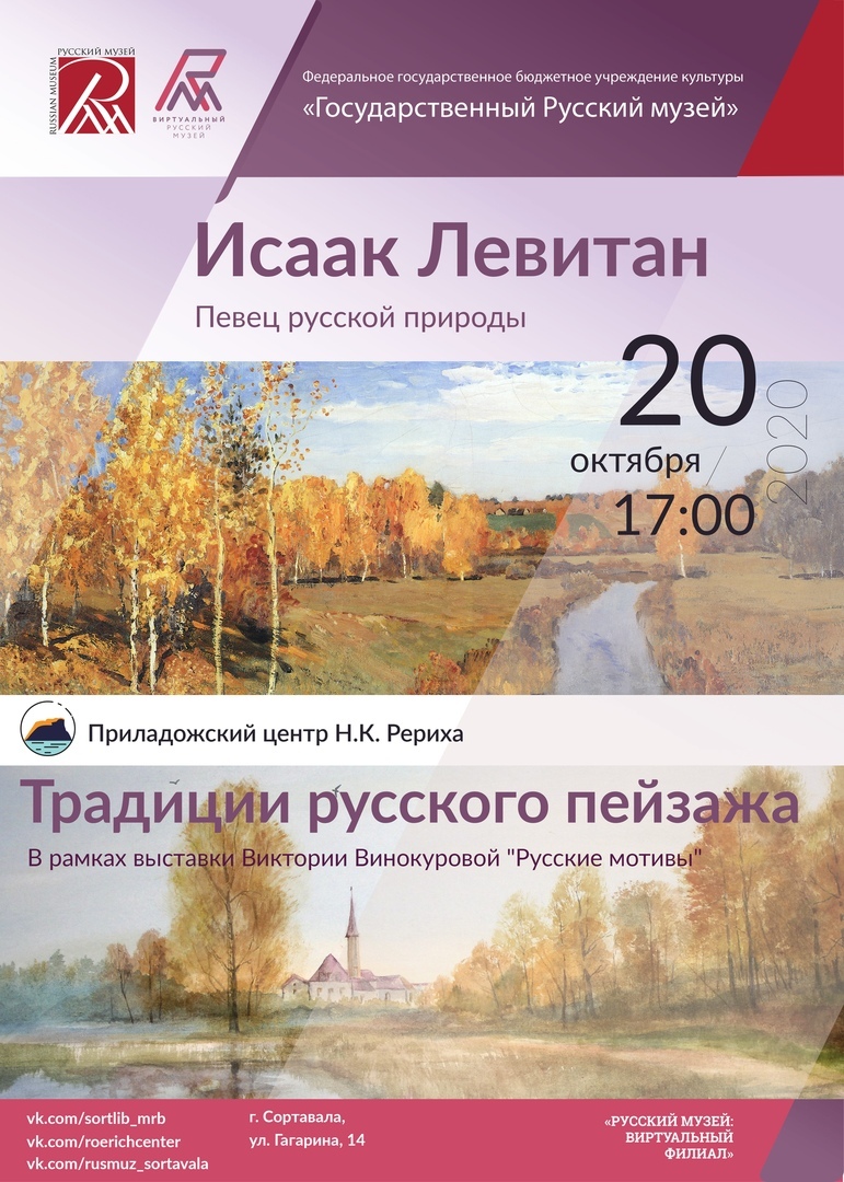 В честь 160-летия со дня рождения выдающегося пейзажиста Исаака Левитана и в рамках выставки Виктории Винокуровой «Русские мотивы» (выставка на данный момент экспонируется в библиотеке), виртуальный филиал Русского музея совместно с Приладожским центром Н. Рериха провели совместное мероприятие: «Традиции русского пейзажа» / «Исаак Левитан. Певец русской природы».