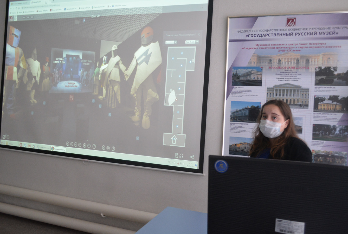 Благодаря 3D-туру студенты смогли побывать на масштабной выставке Русского музея, проходившей в Испании в честь 140-летия Казимира Малевича. Виртуальный тур позволяет увидеть около пятидесяти работ мастера, раскрывающих творческий путь мастера: от раннего творчества художника до всемирно известных произведений и супрематизма, ставшего классикой. Студенты не только рассмотрели в деталях воссозданные по эскизам мастера костюмы для оперы-мистерии «Победа над Солнцем», но и увидели фрагмент футуристической постановки, осуществленной в 2013 году Русским музеем совместно с Московским театром драмы и музыки.