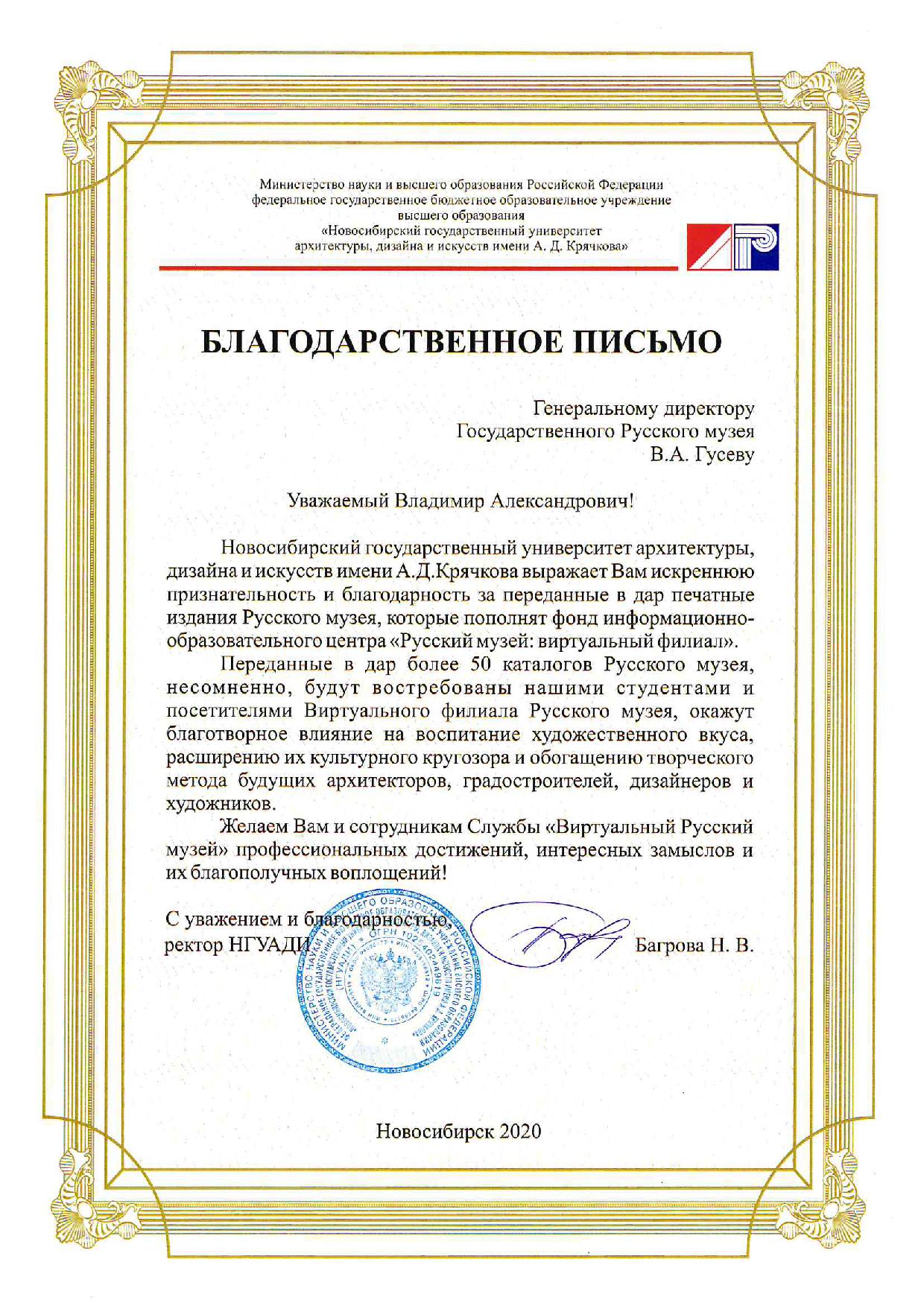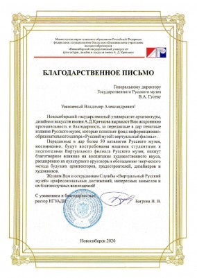 В знак благодарности и уважения в адрес Генерального директора Русского музея Владимира Александровича Гусева ректором Новосибирского государственного университета архитектуры, дизайна и искусств имени А.Д. Крячкова» Наталья Викторовна Багрова было направлено благодарственное письмо: