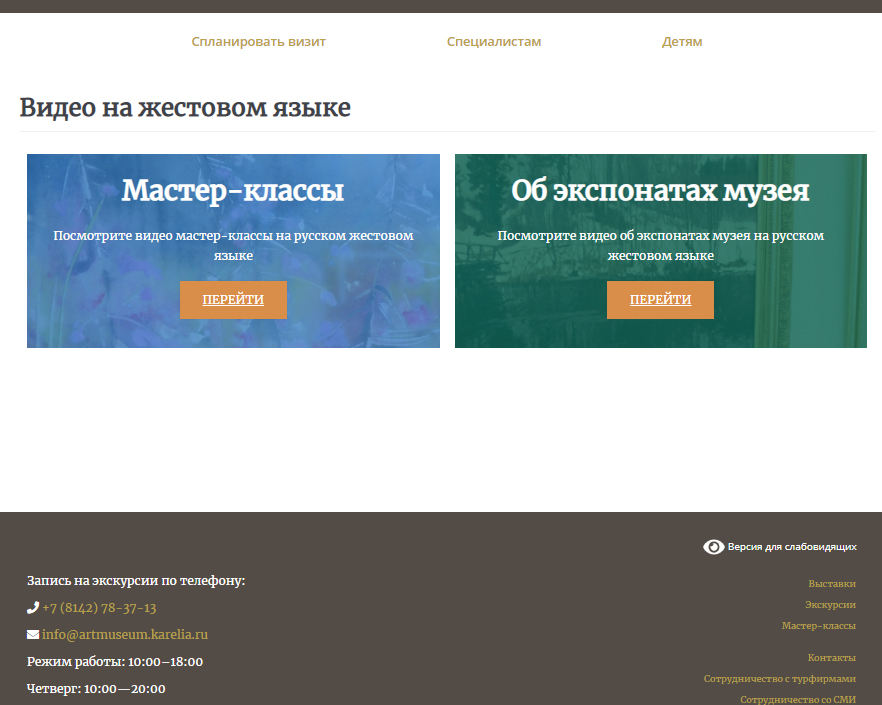 На жестовом языке созданы ролики по некоторым произведениям Тамары Юфа , Николая Брюханова, Мюда Мечева, Николая Кочергина, Бориса Акбулатова, Георгия Стронка, Виталия Добрынина, Игоря Гашкова, а также по одному из эскизов декораций к балету Г. Синисало «Сампо», созданному Андреем Шелковниковым. Видеоролики подготовлены Светланой Зубаревой, сотрудником Музея ИЗО Карелии, и педагогом Мариной Севастьяновой.