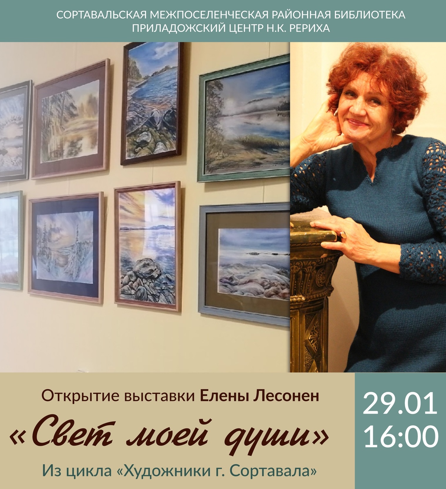 29 января в Сортавальской библиотеке в мультимедийном зале виртуального филиала Русского музея состоялось открытие выставки "Свет моей души" сортавальской художницы Елены Лесонен.