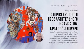 25 марта в рамках работы информационного-образовательного центра «Русский музей: виртуальный филиал» в корпусе Бенуа Русского музея состоялась экскурсия заведующего сектором по работе с молодёжной аудиторией Русского музея, руководителя Студенческого клуба Русского музея, историка искусства, кандидата социологических наук Антона Шевердяева.