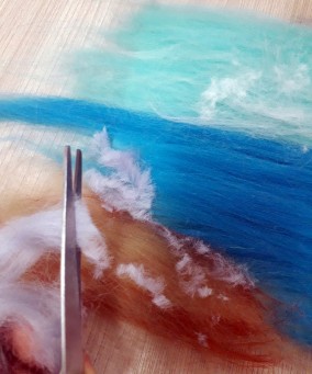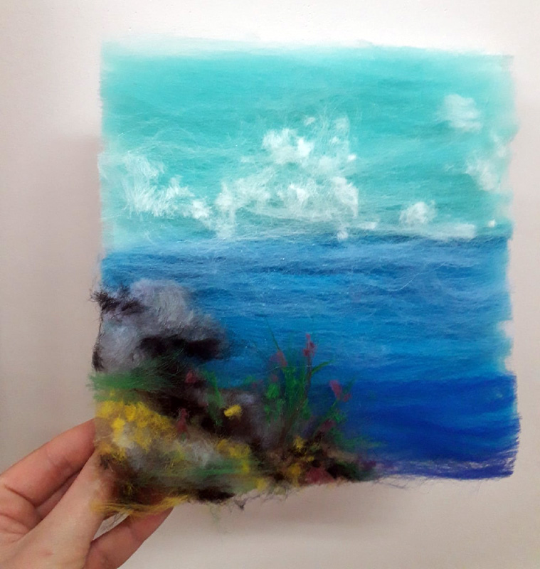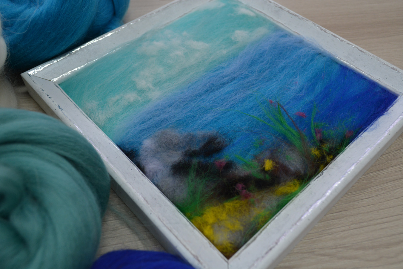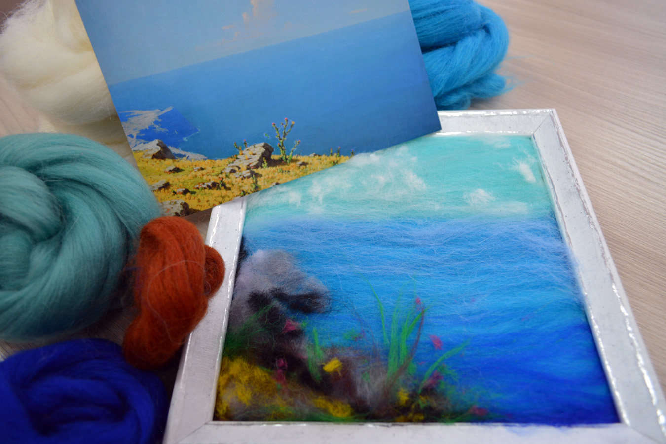 Участники с нетерпением ждали картины, которая станет темой их собственного творчества. И... вздох восхищения — когда они увидели пронзительную синеву в пейзаже Архипа Куинджи «Крым. Море». По мотивам этой работы из собрания Русского музея ребята создали необычные картины из шерсти: теплые, яркие, с ароматными травами на фоне безбрежного моря.