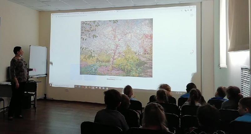 Дошкольники слушали стихи Самуила Маршака, Фёдора Тютчева, Валентина Берестова; описывали картину Николая Крымова «После весеннего дождя», любовались улыбками и яркими нарядами героинь работы  Абрама Архипова «В гостях (В весенний праздник)». Особенно понравилось ребятам полотно Александра Михайловича Герасимова «Яблоня в цвету». Юные зрители стали рассказывать у кого в саду или на даче тоже есть яблони и как красиво они цветут.