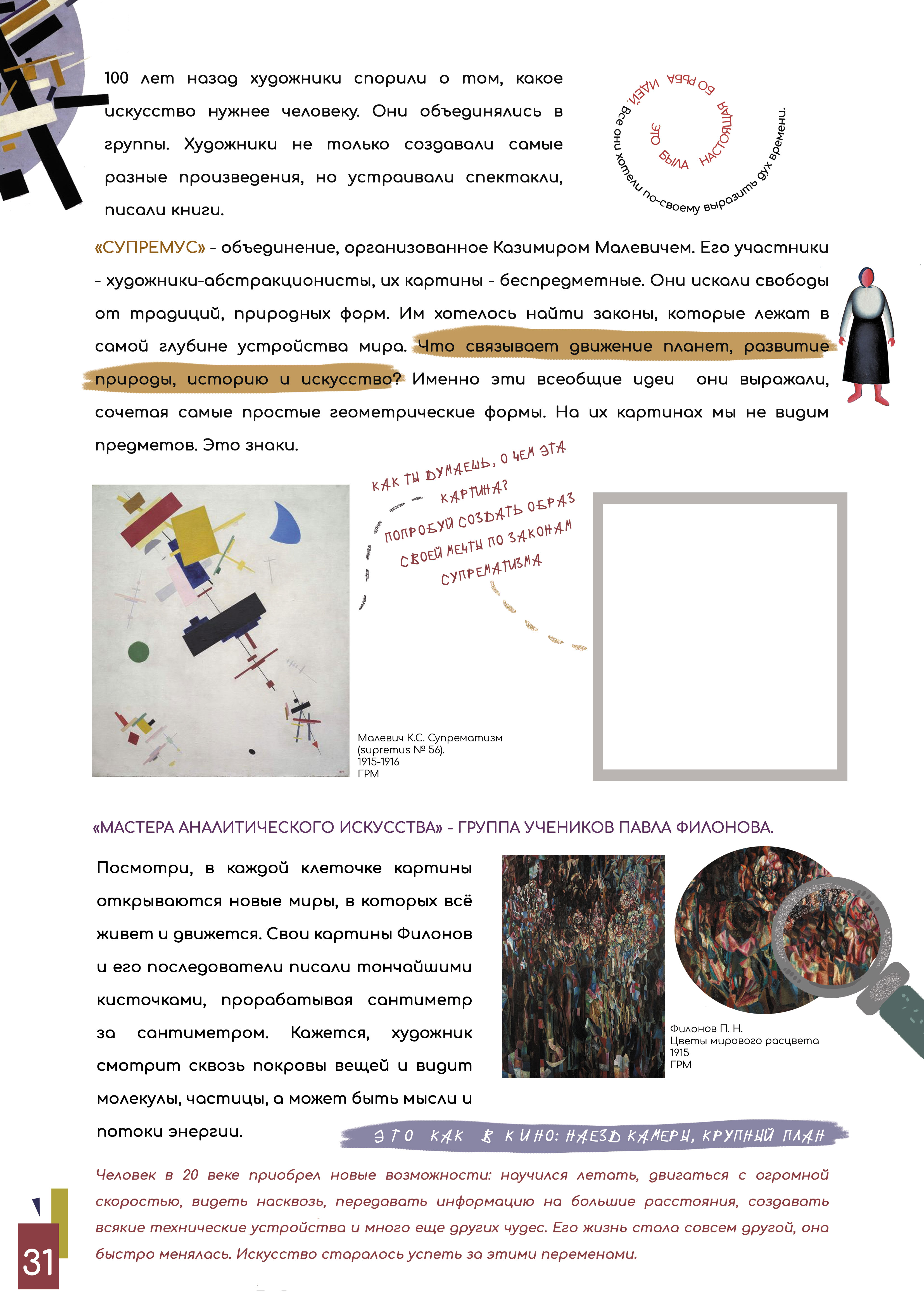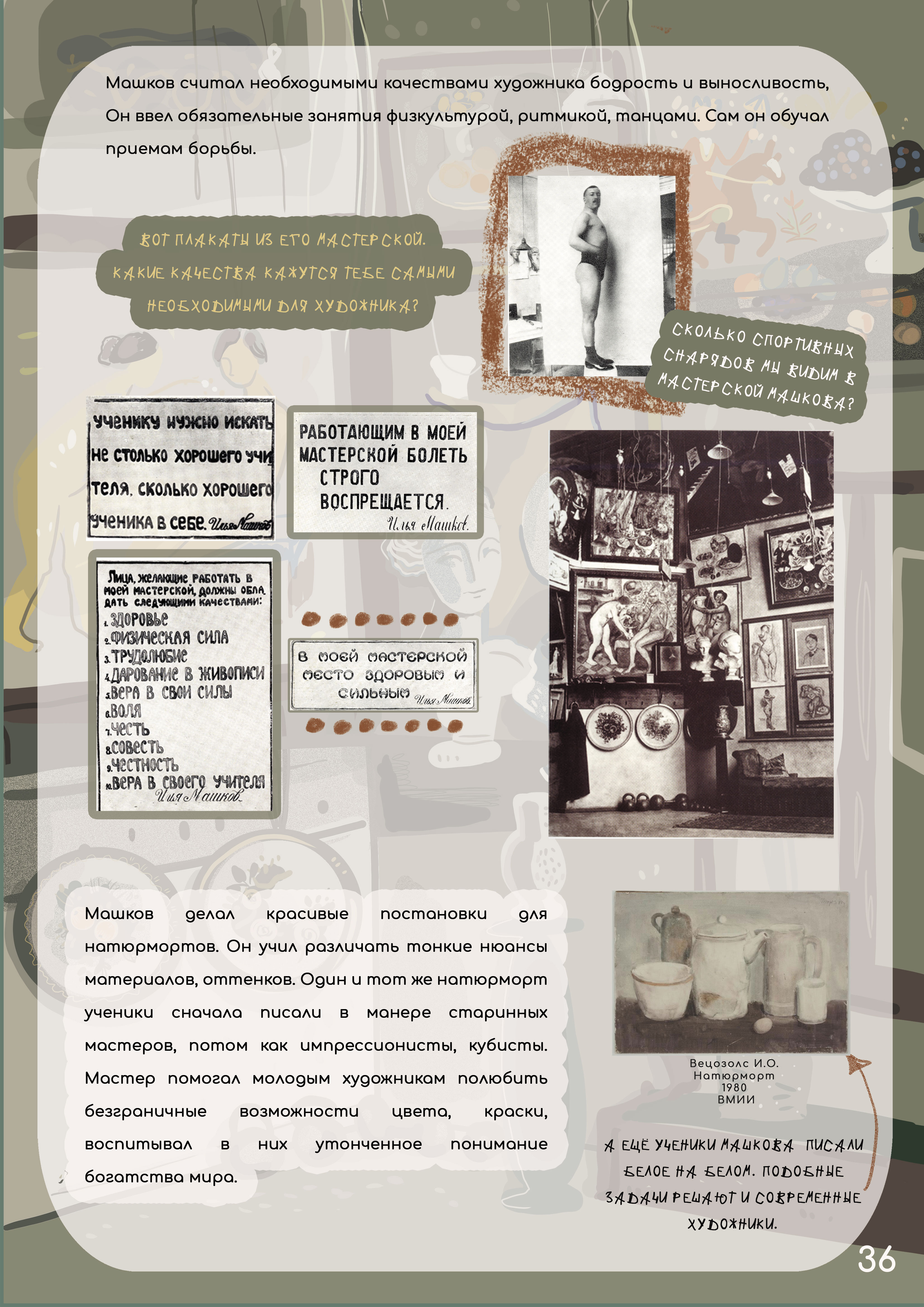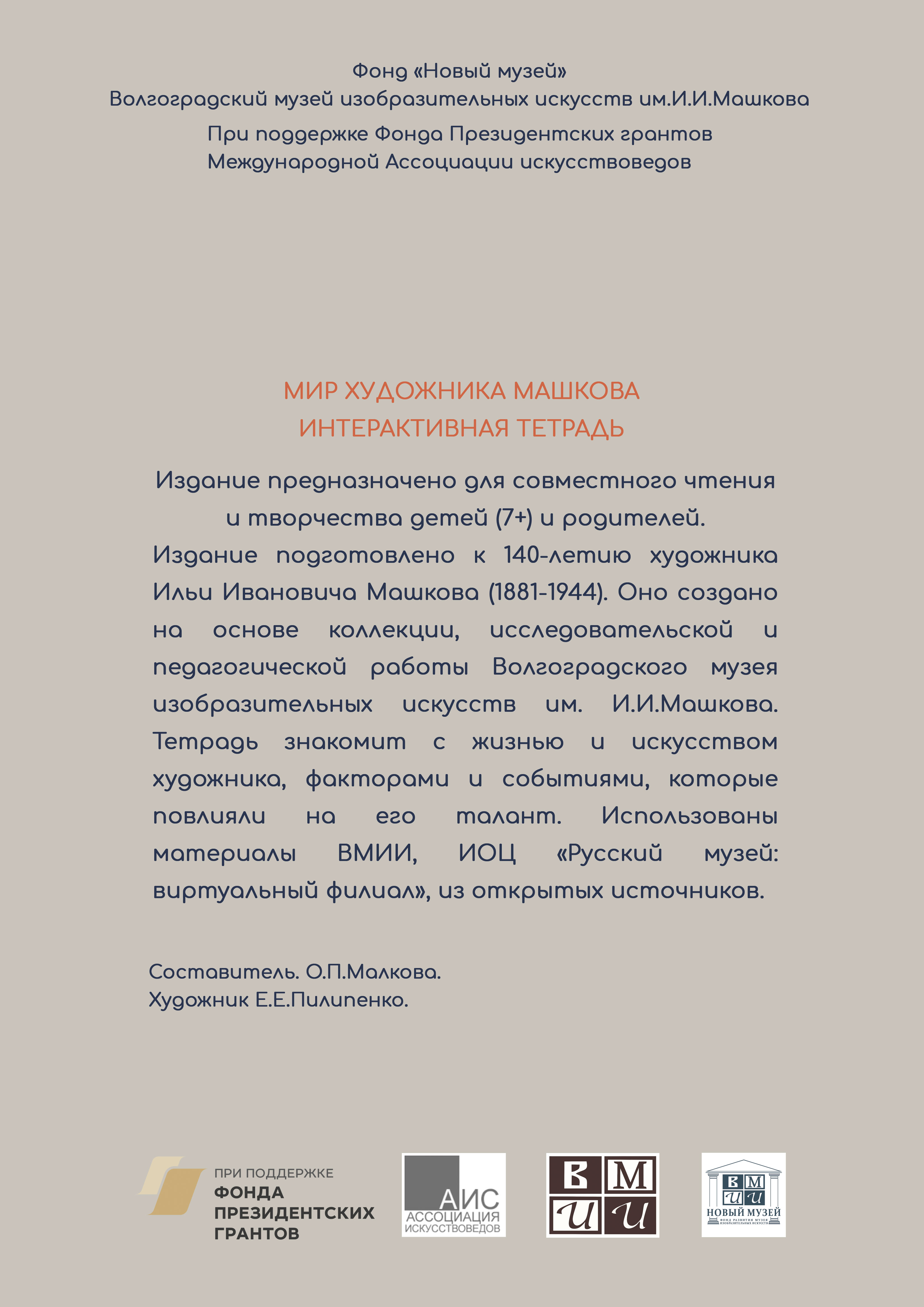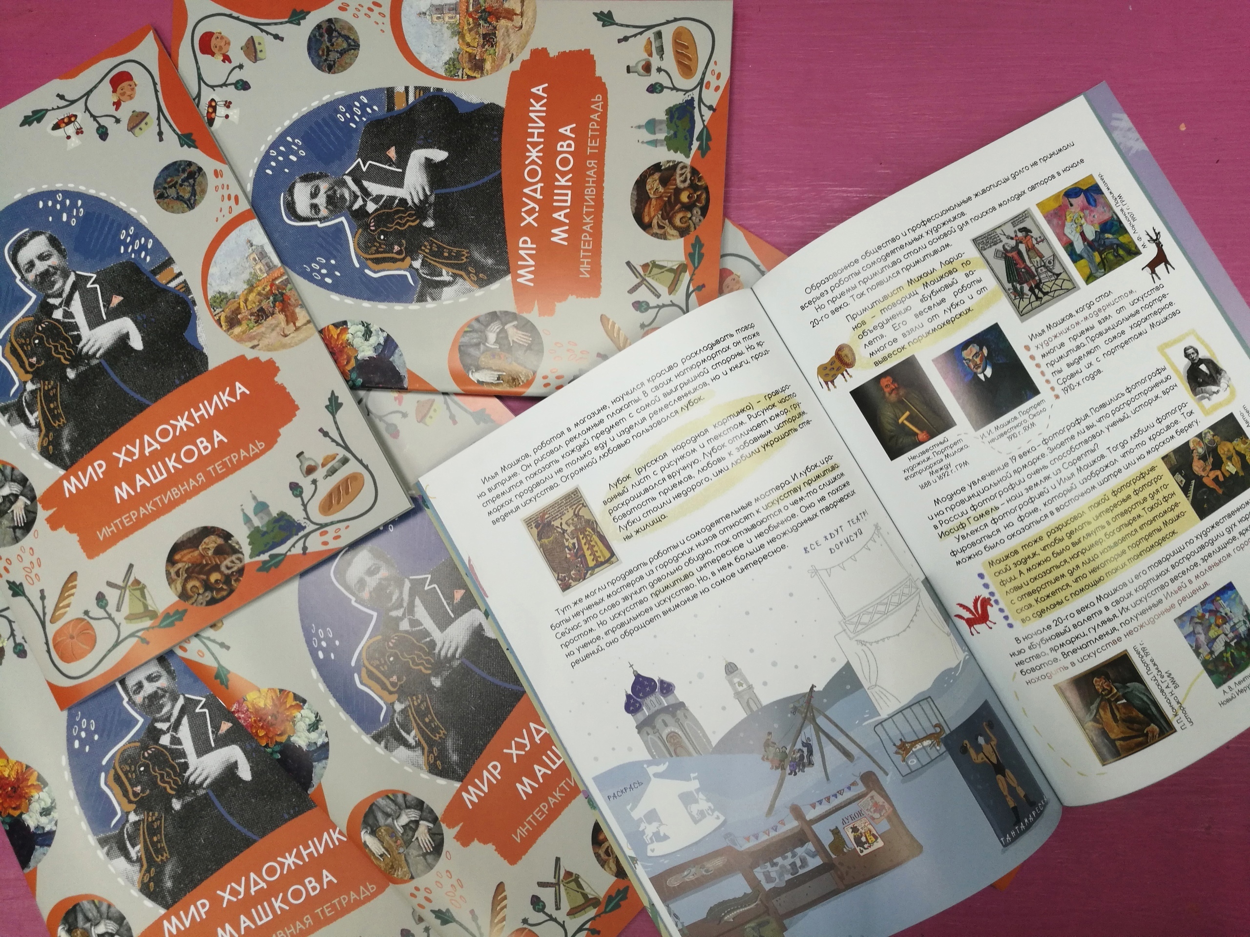 В ряде занятий будет использована интерактивная тетрадь «Мир художника Машкова», которая включает тематические блоки: «Степь», «Провинциальный городок», «Фольклор», «Бубновый валет» и др. Тетрадь знакомит с жизнью и искусством художника, факторами и событиями, которые повлияли на его талант. Издание предназначено для детей от 7-ми лет, содержит теоретический материал и творческие задания.
