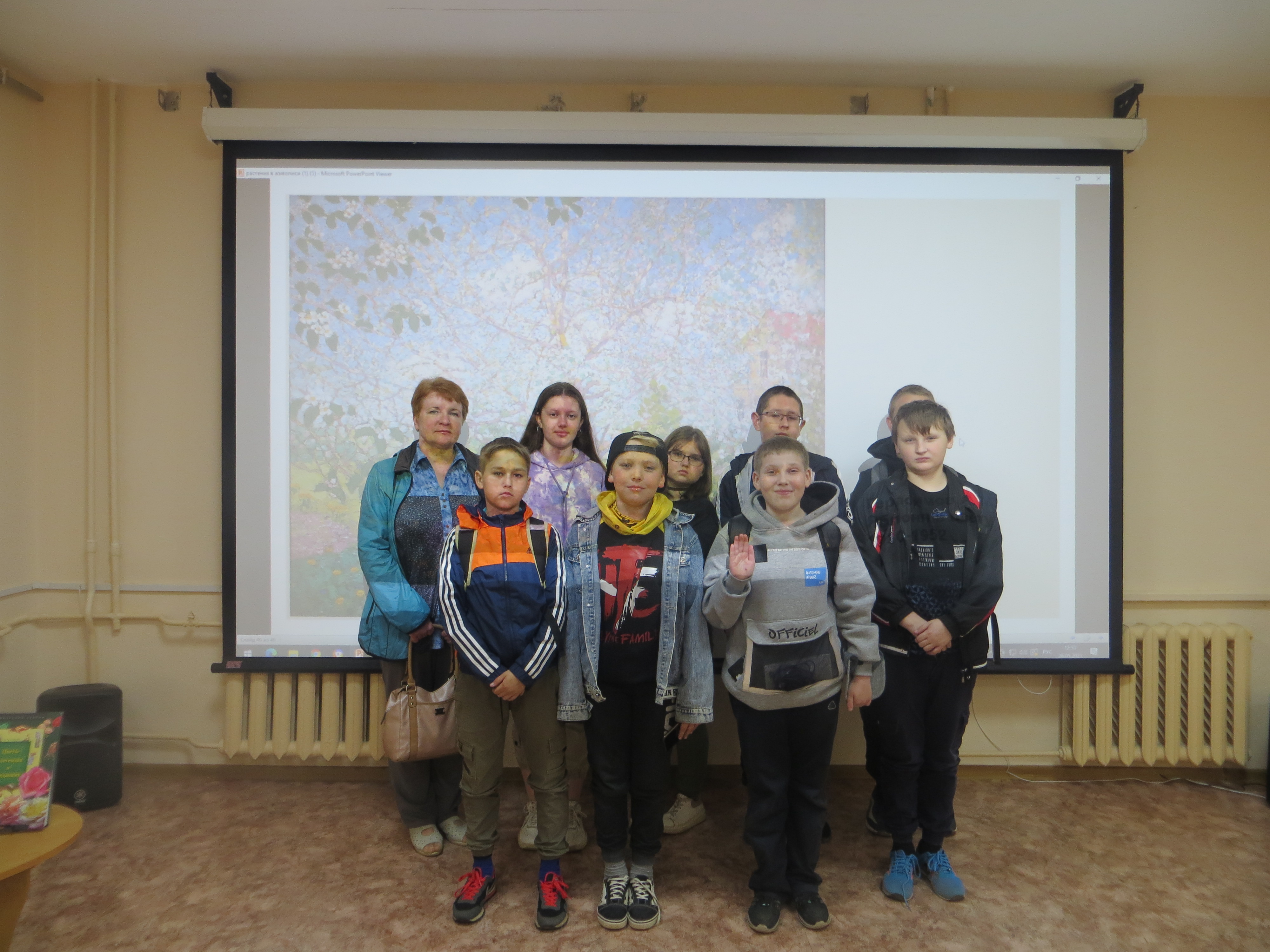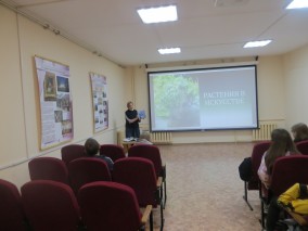 Второе занятие, подготовленное по просьбе учителей Солнечной СОШ, Солнечной сельской библиотекой, виртуальным филиалом Русского музея совместно с Народной картинной галереей - «Растение в искусстве». Учащимся 6 класса была продемонстрирована презентация по заданной теме. Ребята увидели в презентации и художественных альбомах работы с изображением растений из коллекции Русского музея. Особый интерес вызвала символика растений в картинах мастеров эпох средневековья и возрождения. В конце мероприятия весь класс прошёл по залам Народной картинной галереи, где подростки на картинах экспозиции увидели изображение растений.