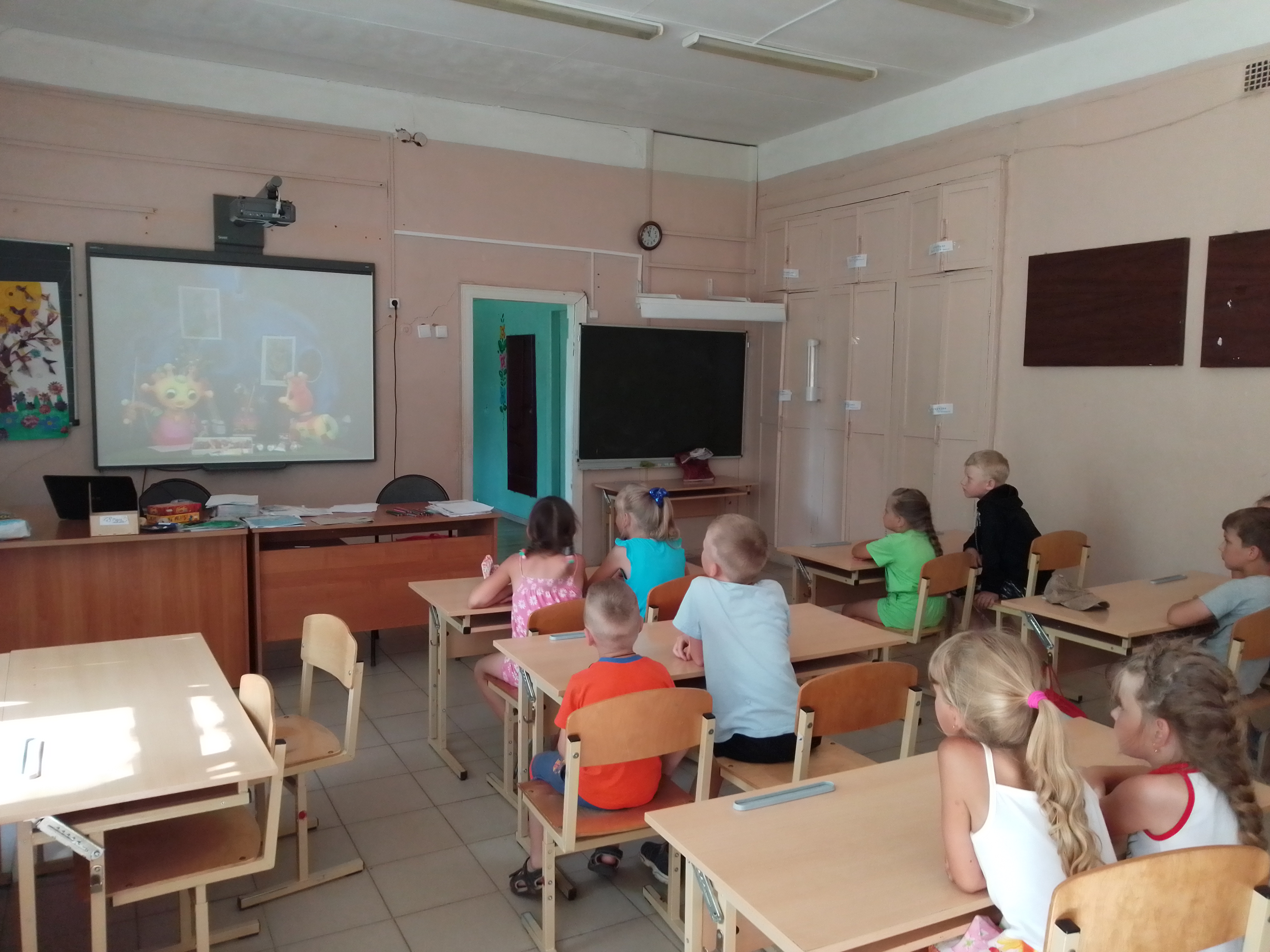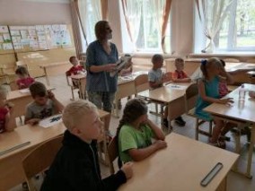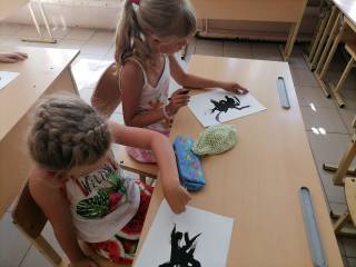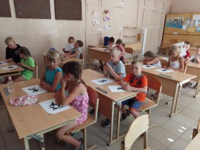 Второе в это лето выездное мероприятие Солнечной сельской библиотеки виртуального филиала Русского музея прошло в школьном летнем лагере поселка городского типа Красномайский. Совместно с сотрудниками Красномайской библиотеки, для будущих первоклассников было проведено занятие "Удивительная клякса". Ребята посмотрели фильм Русского музея "Кляксы" и сами попробовали пофантазировать над предложенными кляксами. Дети узнали что такое кляксография и какие бывают техники рисования кляксами. Поговорили о жанрах живописи, нарисовали пейзажи и натюрморты.