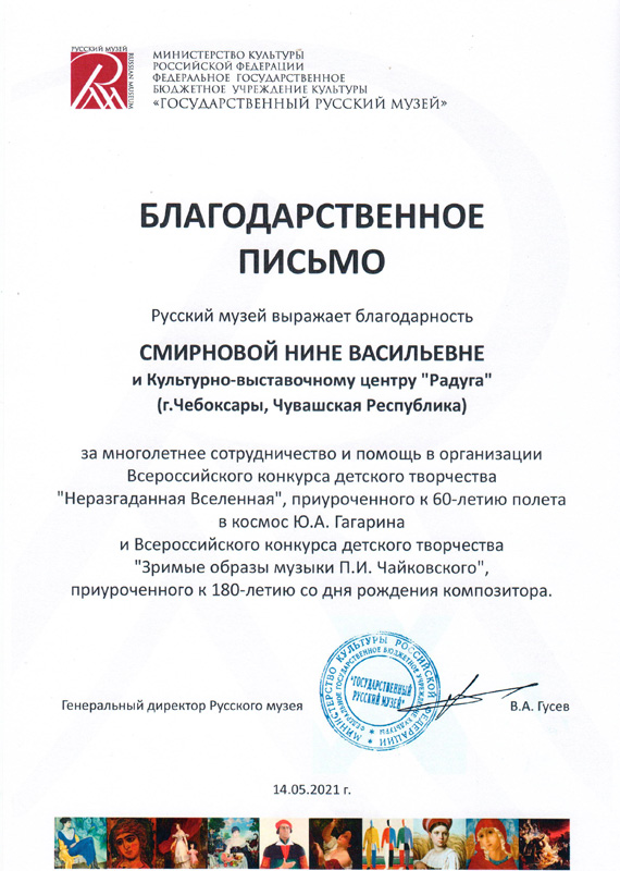 В адрес Культурно-выставочного центра «Радуга» поступило благодарственное письмо генерального директора Государственного Русского музея Владимира Гусева за многолетнее сотрудничество и помощь в организации Всероссийского конкурса детского творчества «Неразгаданная Вселенная», приуроченного к 60-летию полета в космос Ю.А. Гагарина и Всероссийского конкурса детского творчества «Зримые образы музыки П.И. Чайковского», приуроченного к 180-летию со дня рождения композитора.