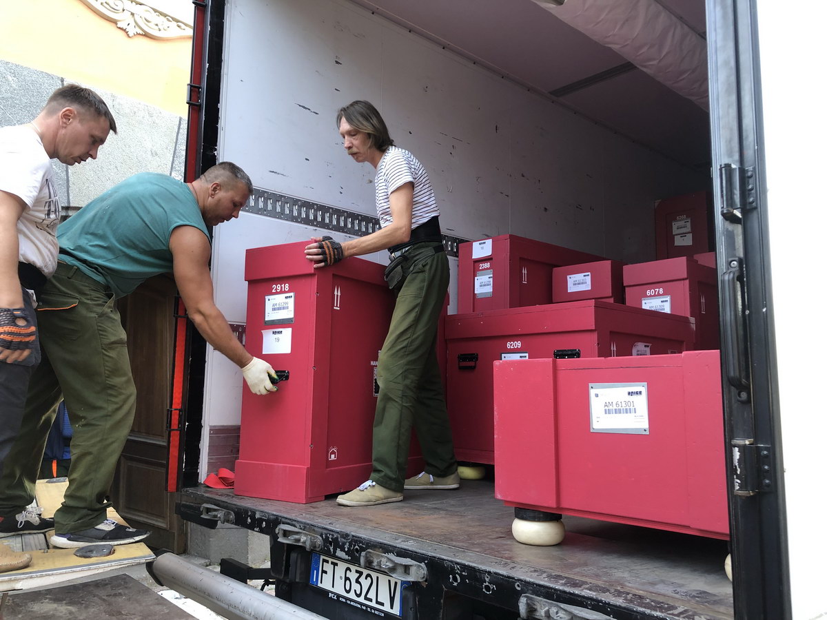 Машина итальянского консульства не была оборудована специальным подъемным механизмом, поэтому для разгрузки пришлось воспользоваться машиной Русского музея Сотрудники сектора технического обеспечения выставок, занимающиеся такелажными работами, слаженно и бережно доставили ящики в залы, где работы в дальнейшем будут экспонироваться.