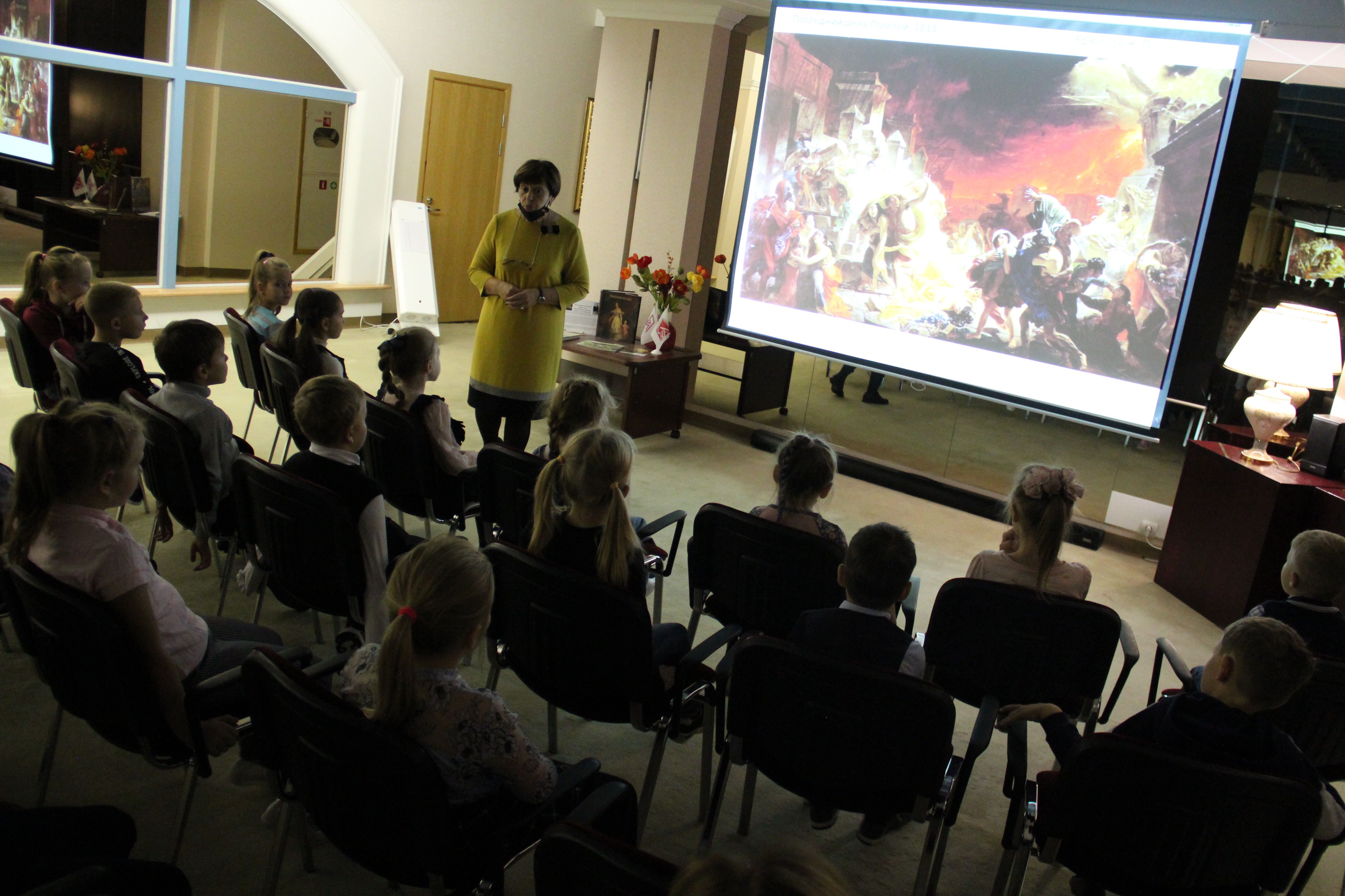 Нашим первоклассникам мы постарались рассказать о музее интересно; о том, что мастерам нужно озарение и вдохновение; они помогают создавать прекрасные произведения искусства. Рассматривая произведения искусства в залах Русского музея, нашей задачей было донести юным зрителям, что музы посещали живописцев, скульпторов и архитекторов в часы ежедневного и кропотливого труда.
