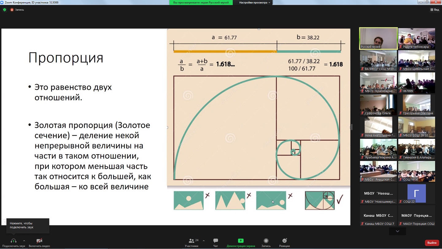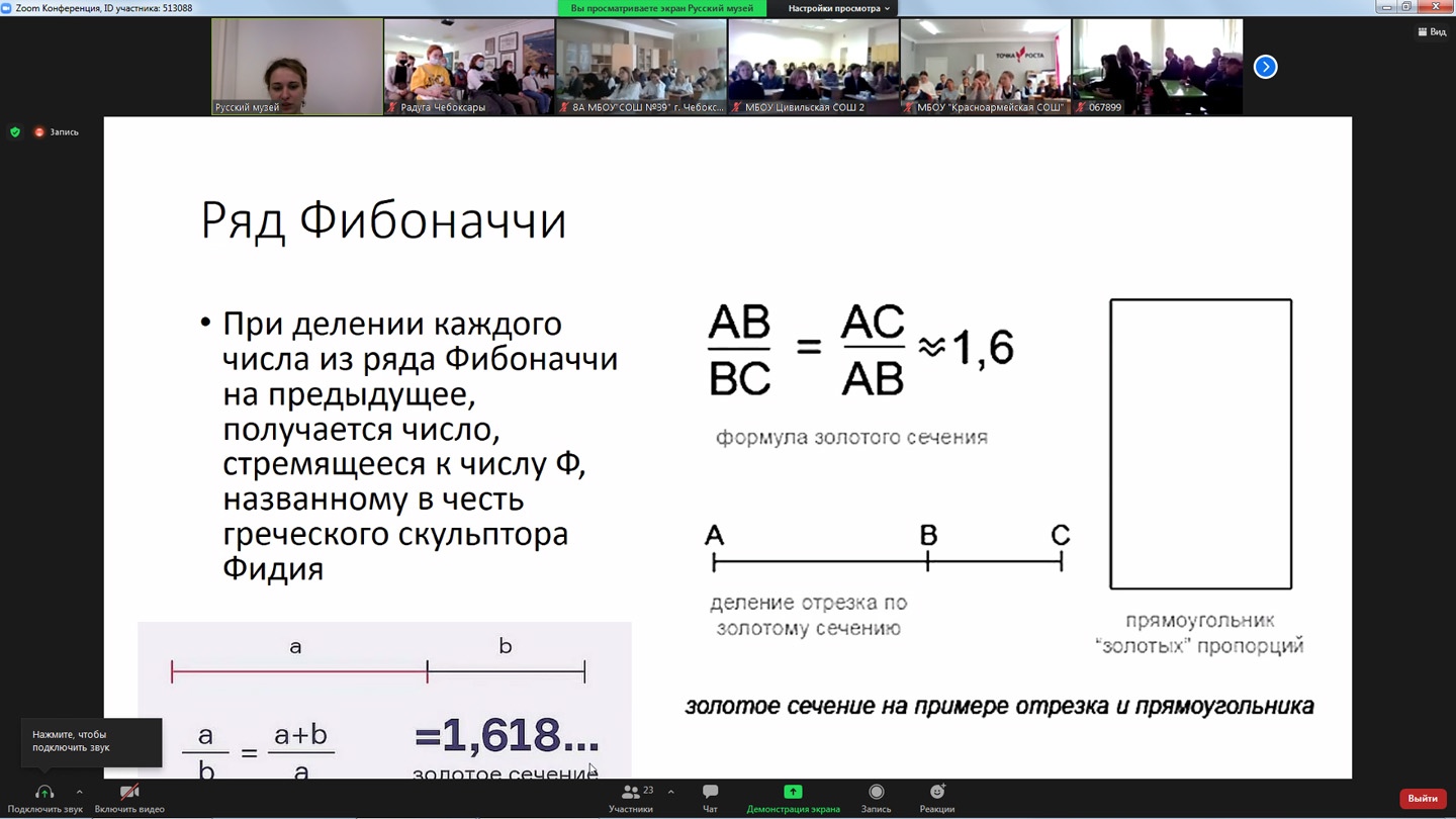 Как математические принципы помогают творцам упорядочить композицию, создать гармоничный образ, воплотить представление об идеальном мироустройстве? Обо всем этом и не только узнали ребята от специалиста по музейно-образовательной деятельности отдела «Российский центр музейной педагогики и детского творчества» Государственного Русского музея Маргариты Неждановой на онлайн-лекции «Золотая пропорция, симметрия, перспектива, фракталы и другие математические феномены в контексте изобразительного искусства».