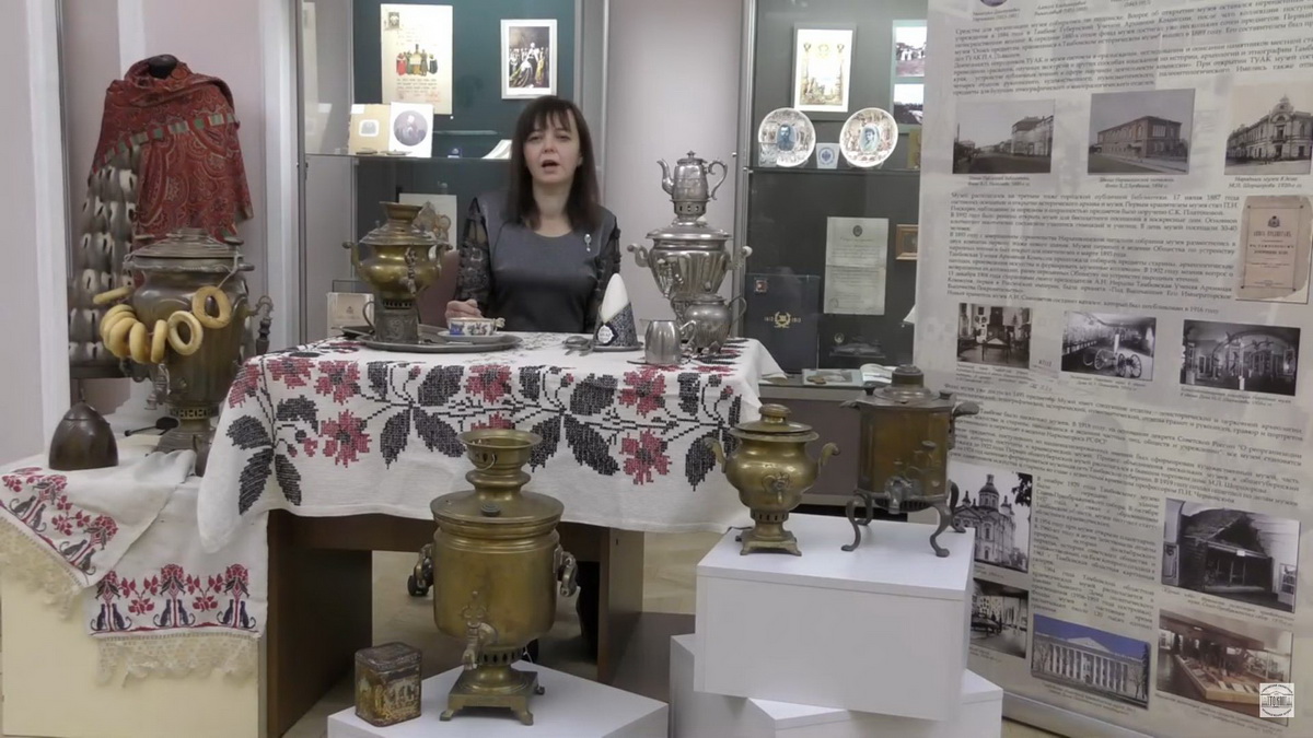 Сотрудник рассказала о самоварной столице, о самых разнообразных формах самовара: «банка», «рюмка», «яйцо», «репка», «ваза», «кратер», о клеймах на самоварах.