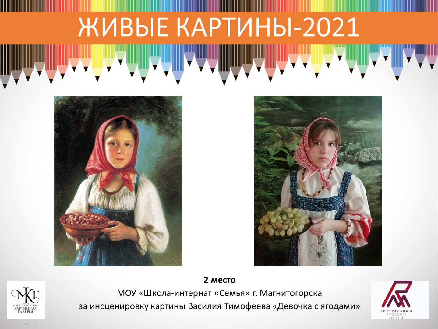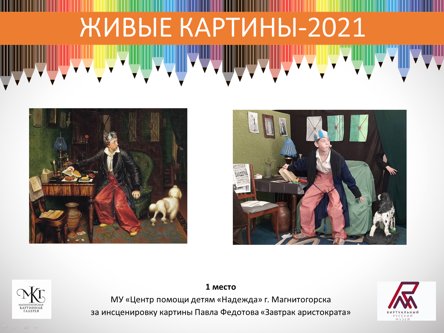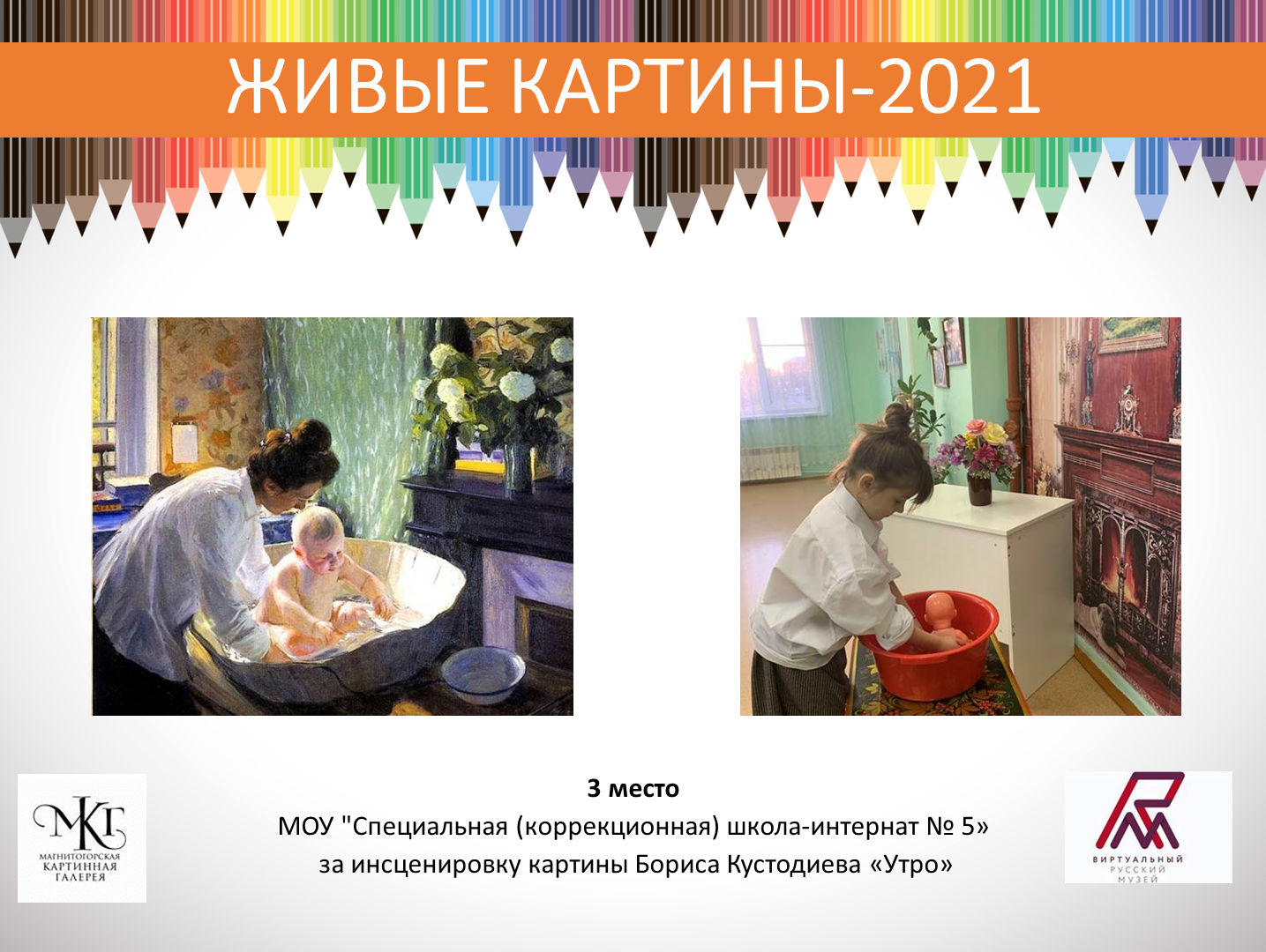 После обсуждения жюри конкурса «Живые картины» (председатель жюри Кривошапко Ю.П. – директор МКГ, и членов жюри Филатовой Л.И. – заведующего ИОЦ «Русский музей: виртуальный филиал», Финогеновой В.Ю.– старшим научным сотрудником ИОЦ) объявило, что I место в конкурсе завоевал центр «Надежда», «ожививший» знаменитую картину Павла Федотова «Завтрак аристократа». II место присвоено школе-интернату «Семья» за показ «Девочки с ягодами» Василия Тимофеева. И школе-интернату №5 присудили III место за воспроизведение картины Бориса Кустодиева «Утро».