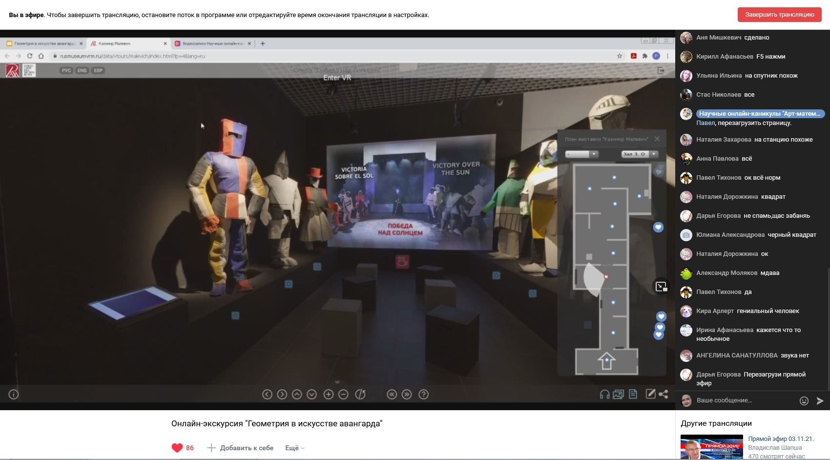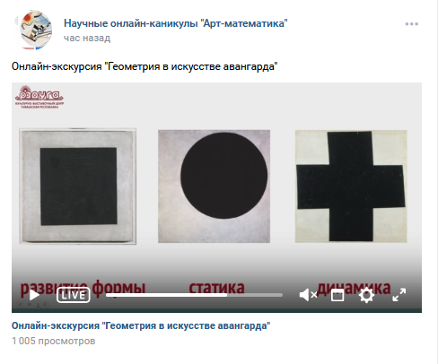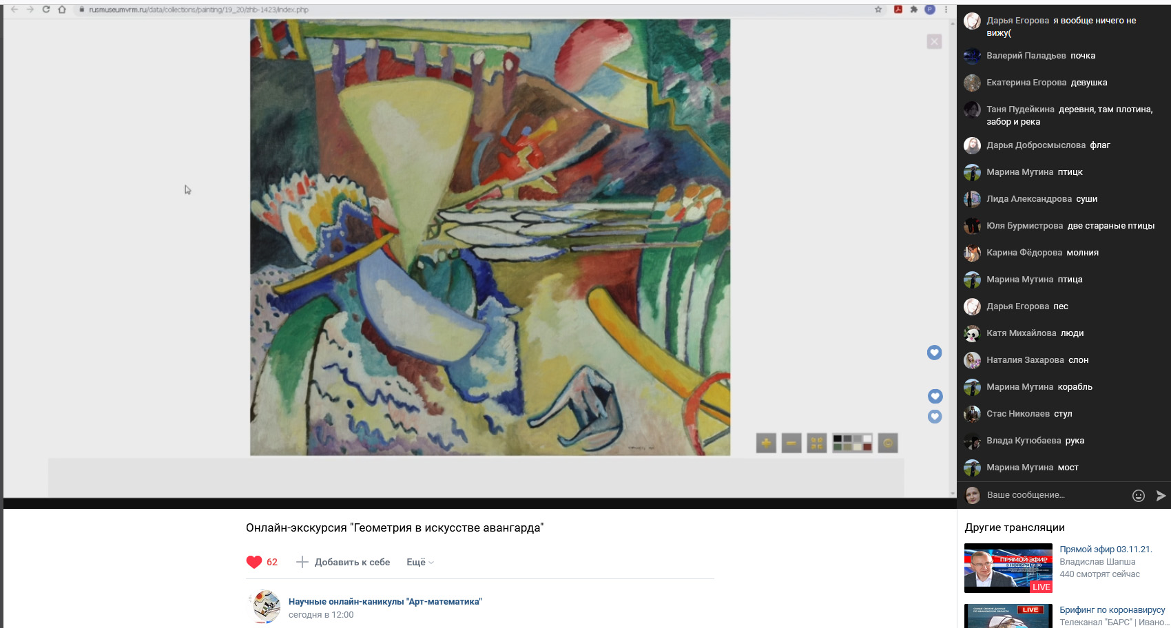 На онлайн-трансляции участники научных каникул «Арт-математика» узнали о математических секретах авангардной живописи, совершили путешествие по залам Государственного Русского музея, который располагает одной из крупнейших коллекций произведений русского авангарда и его ведущих мастеров. Ребята услышали, как «звучит» абстрактная геометрия картин Василия Кандинского. Благодаря 3D-туру Виртуального Русского музея школьники Республики смогли побывать на масштабной выставке Русского музея, проходившей в Испании в честь 140-летия Казимира Малевича. Они не только рассмотрели в деталях воссозданные по эскизам мастера костюмы для оперы-мистерии «Победа над Солнцем», но и увидели фрагмент футуристической постановки, осуществленной в 2013 году Русским музеем совместно с Московским театром драмы и музыки.