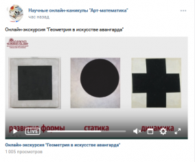 Синтез геометрии и искусств – живописи, музыки, театра – стал лейтмотивом и онлайн-викторины «Азбука русского авангарда», в которой школьники проверили свои знания, и видеомастер-класса «Беспредметное». Ребята создали свои абстрактные импровизации с использованием различных графических материалов и коллажа. Вдохновением для них стали произведения из альбома «Русский авангард» Виртуального Русского музея.