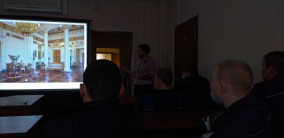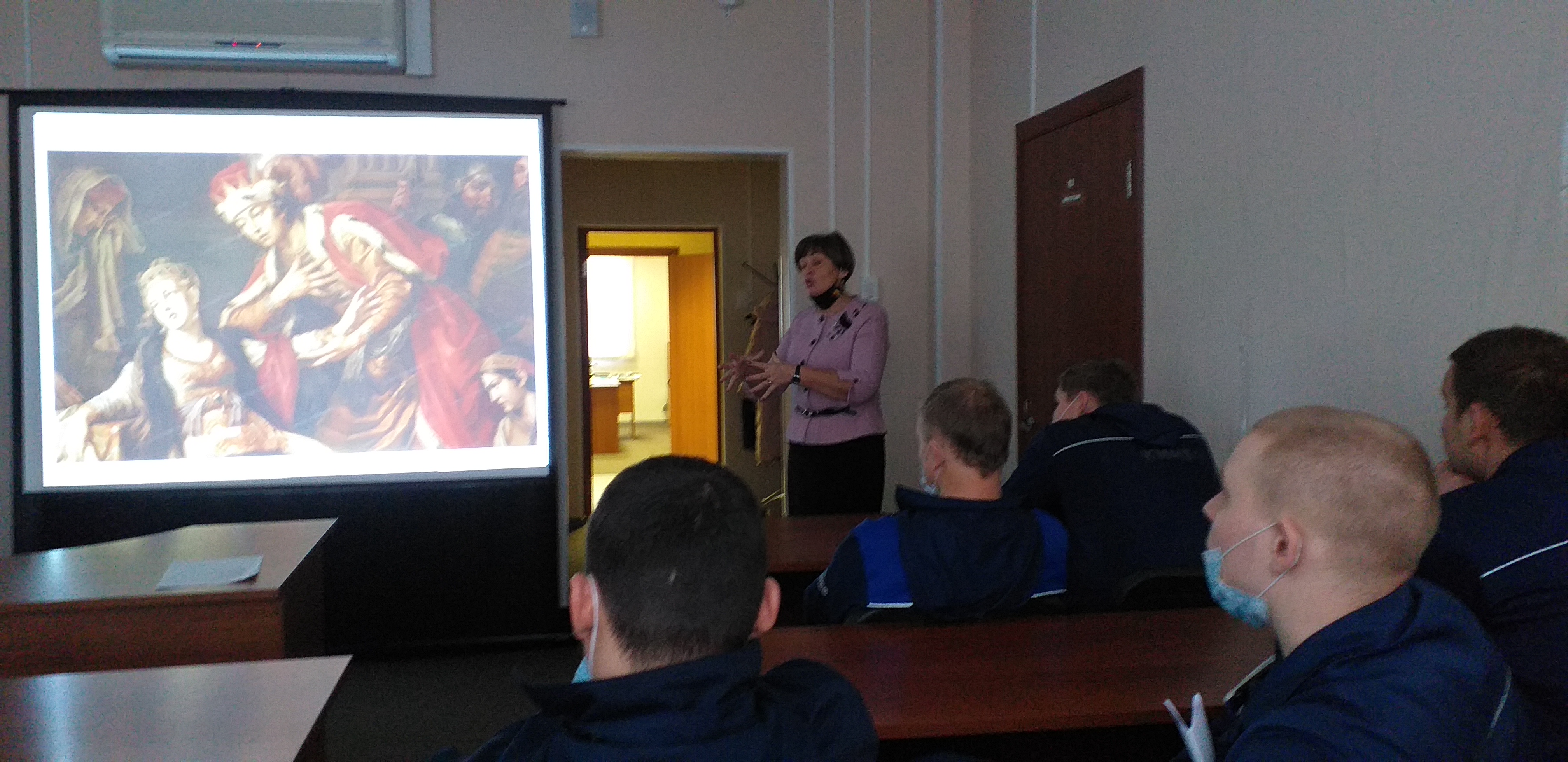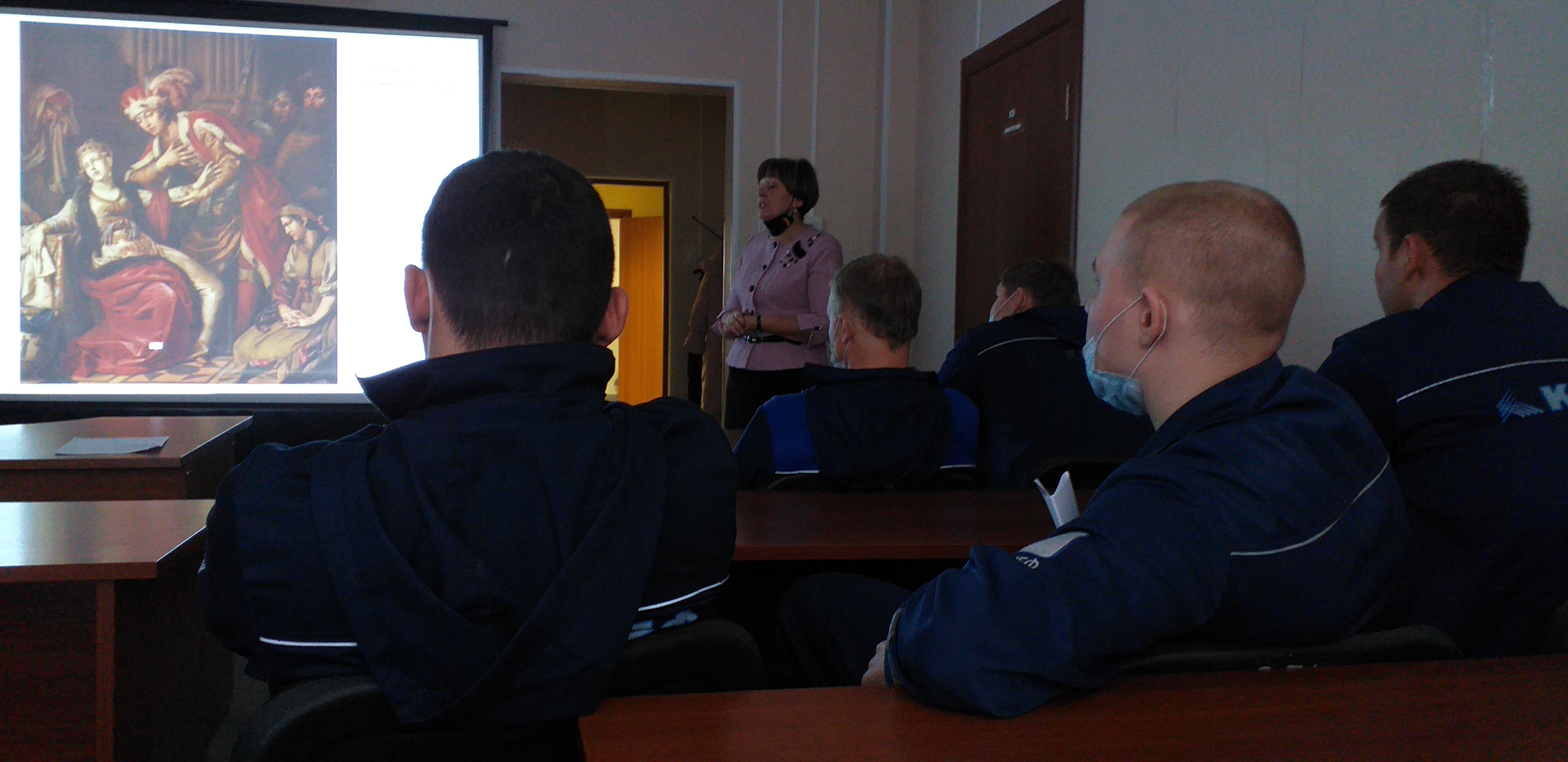 Выездная экскурсия в один из цехов предприятия была посвящена знакомству с шедеврами Русского музея. И так как большую часть посетителей представляли мужчины, то и говорили мы о мужестве, храбрости и стойкости наших защитников.