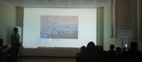 А вот и другие полотна, показывающие суровый климат Заполярья – скалистые берега холодных морей и рек, строгие птицы, сидящие на скалах; люди в меховых одеждах, едущие в санях, с запряжёнными оленями. Эти работы автор привёз из путешествия на Север.