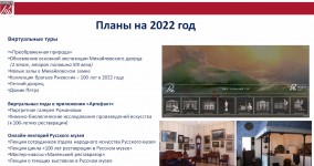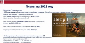 Среди грядущих событий 2022 года - проведение очередного, X Международного конкурса мультимедийных ресурсов «Петр I и его эпоха в русском искусстве», а также XII Международного молодежного поэтического конкурса им. К.Р. Среди значимых событий года, помимо 350-летия Петра Великого и Года народного искусства - празднование 100-летия реставрации в Русском музее. К этим датам службой "Виртуальный Русский музей" запланировано создание специальных цифровых ресурсов и проведение совместных юбилейных мероприятий.