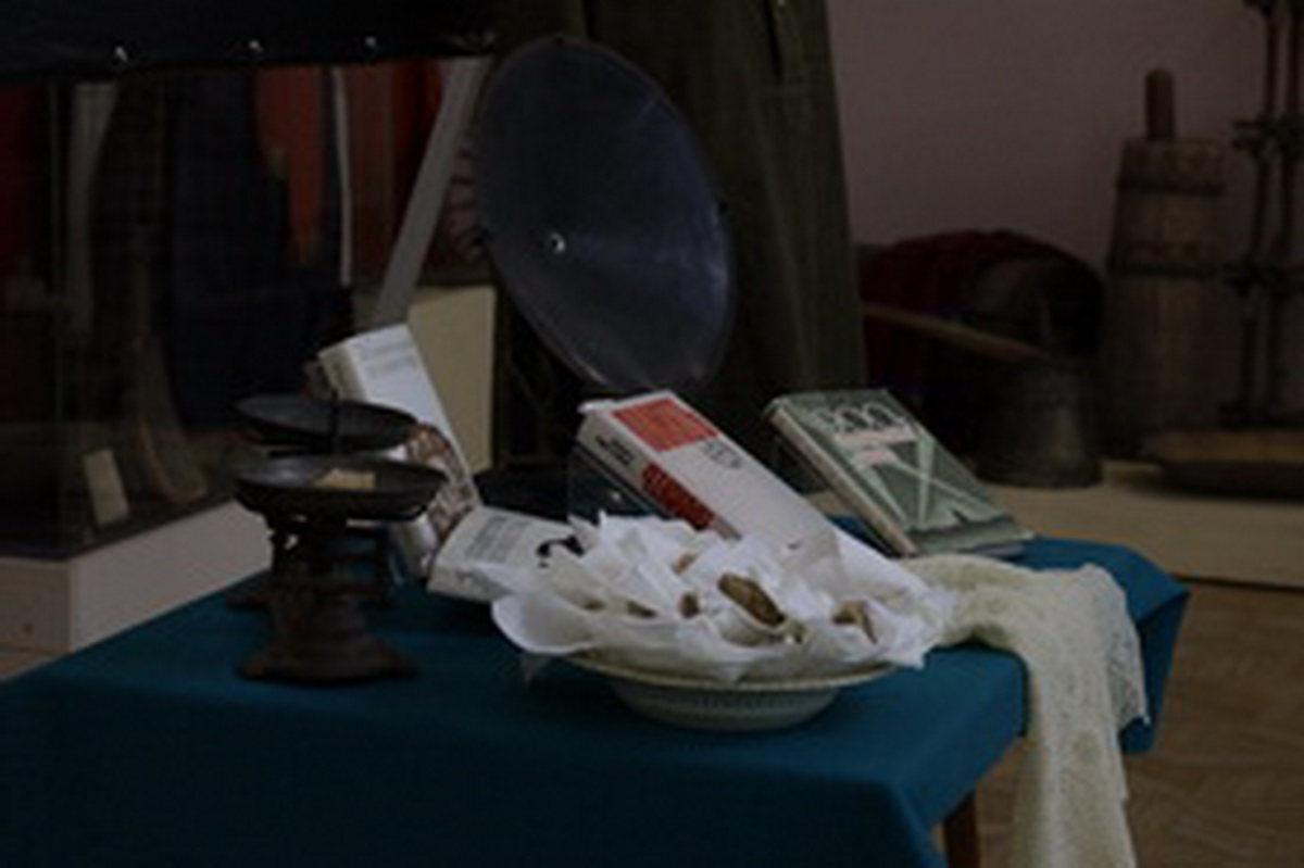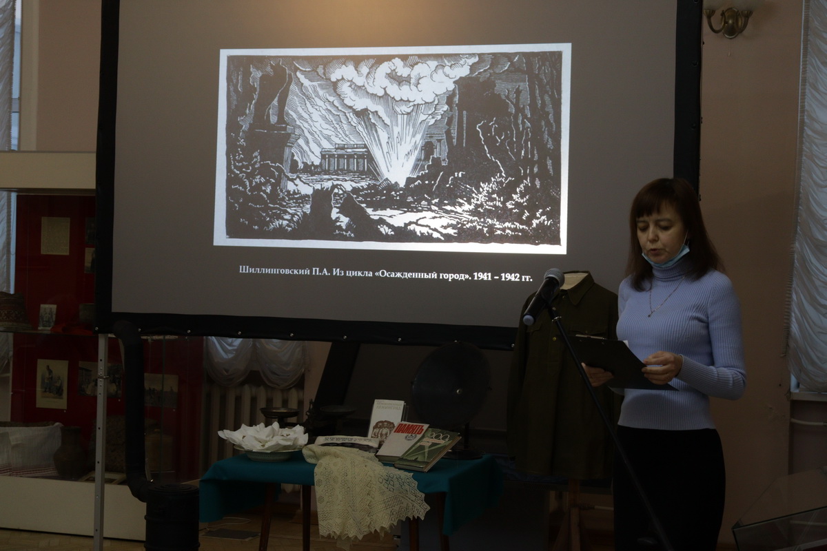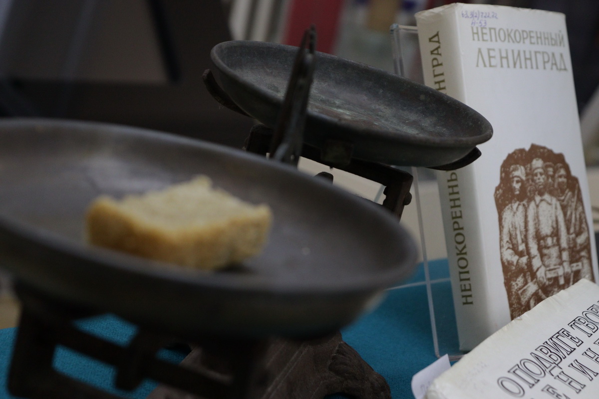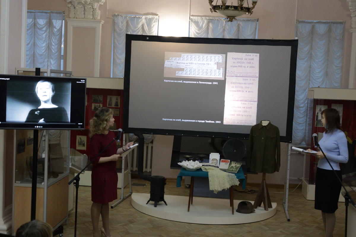 На мини-выставке была представлена шаль блокадницы, жительницы города Тамбов Шмелевой Ларисы Михайловны, которую передала В.Д. Орлова, а также весы, книги, гимнастерка, печка буржуйка Тамбовского завода «Ревтруд», медаль «За оборону Ленинграда».