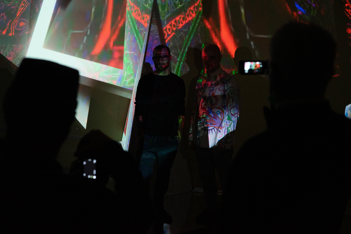 На широкоформатном экране предстал визуальный ряд, созданный коллективом сотрудников Русского музея совместно с медиахудожниками Дмитрием Матковским и Виктором Сафрошиным. Дмитрий Матковский, который в 1980-х годах также был участником группы «АукцЫон», показывает на экспозиции «Посвящение космонавтике» свое первое мультимедийное произведение, совмещающее музыку, живопись и цифровые технологии. Принцип коллажности, положенный в основу его инсталляции, можно, как и поэтические эксперименты группы «ОРК и КО», считать продолжением традиций русского авангарда.