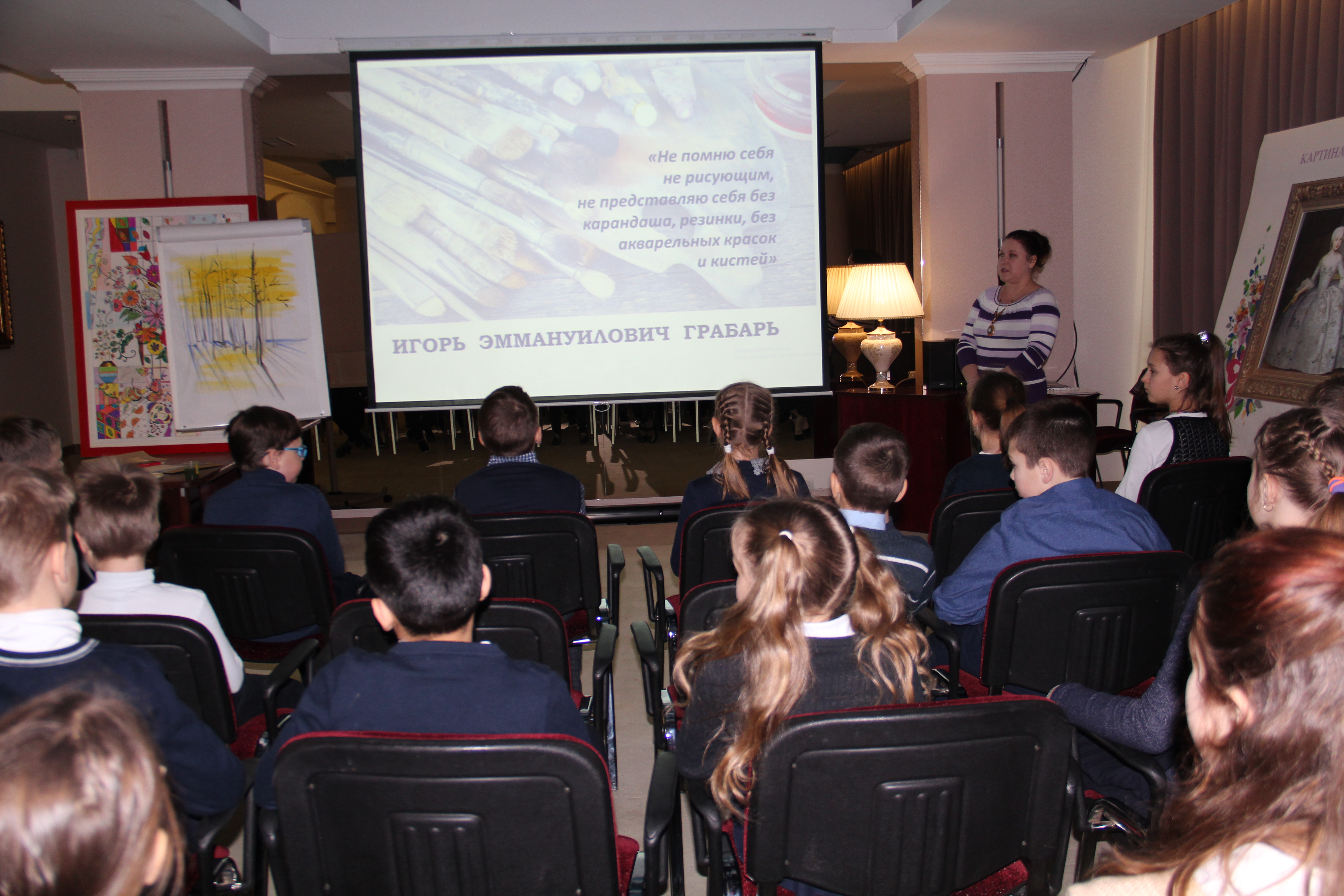 Рассказывая о творчестве художника, мы немного поговорили о детстве, увлечениях. Детям было интересно услышать воспоминания И. Грабаря о его первом знакомстве с масляной краской.