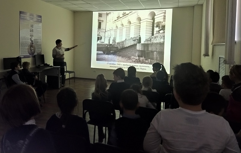 Из фрагментов документального фильма  «Бурлаки на Каме» (2013) дети увидели, как сотрудники готовили произведения искусства к эвакуации,  как  снятые с подрамников большие полотна накатывали на валы, картины меньшего размера и небольшие скульптуры упаковывали в ящики.