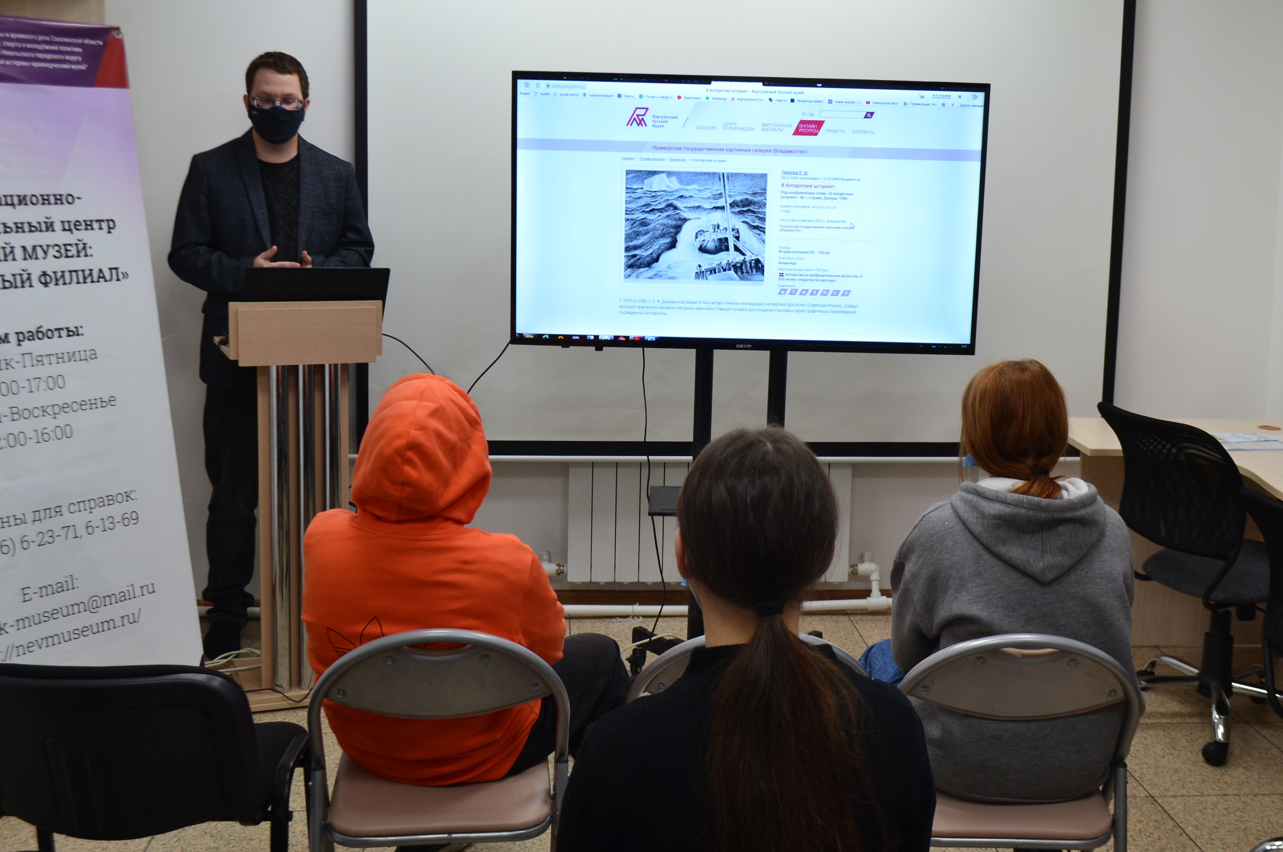 Для участников также была подготовлена виртуальная выставка «Шторм на море на картинах художников». На примере картин И.К.Айвазовского «Морской вид. Шторм на море» и Е.Ф.Димура «В Антарктике штормит» (детские и школьные годы художника прошли на Сахалине), ребята познакомились с техникой «штормовой живописи», с её величественными изображениями разгулявшейся морской стихии, поражающей своей мощью и непредсказуемыми последствиями.