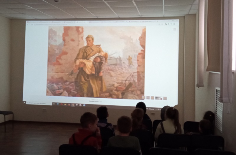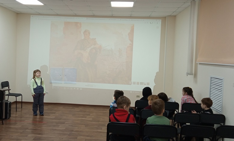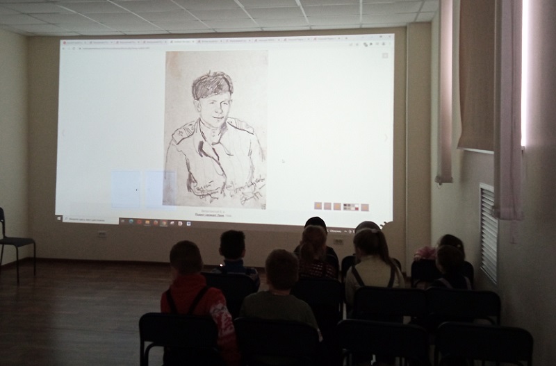 А это тоже лётчик – Герой Советского Союза, лётчик-истребитель капитан С. Г. Литаврин. Дошкольников поразила картина Дейнеки А. А. «Оборона Севастополя», в которой советские войны вступили в рукопашный бой с фашистскими захватчиками. Кроме этого, маленькие зрители внимательно рассматривали картину Невежина Ф. И. «Русский солдат».