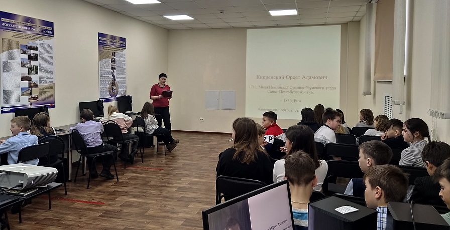 Школьники познакомились с интересной биографией художника, увидели его произведения из коллекции Русского музея и других. Ребята узнали портрет А. С. Пушкина кисти Кипренского, ведь его репродукции очень часто печатают в учебниках.