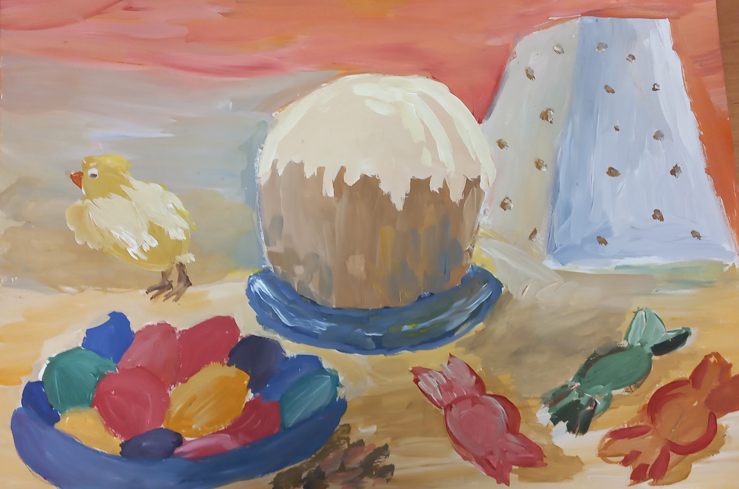 К Пасхальным праздникам детям было предложено написать натюрморт гуашью по мотивам работ живописцев, входивших в "Союз русских художников", таких как И.Грабарь, С.Жуковский, С.Виноградов и др.